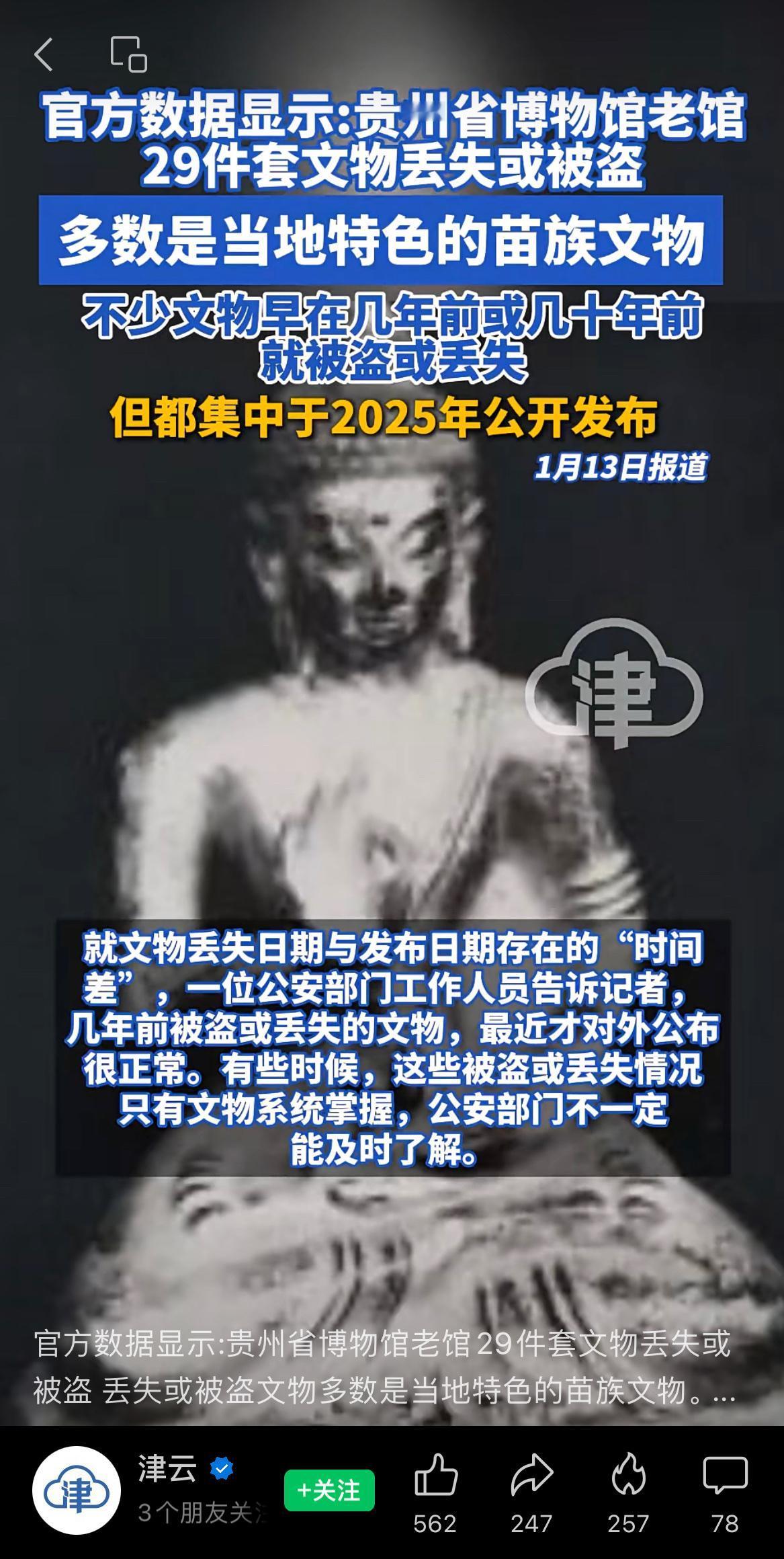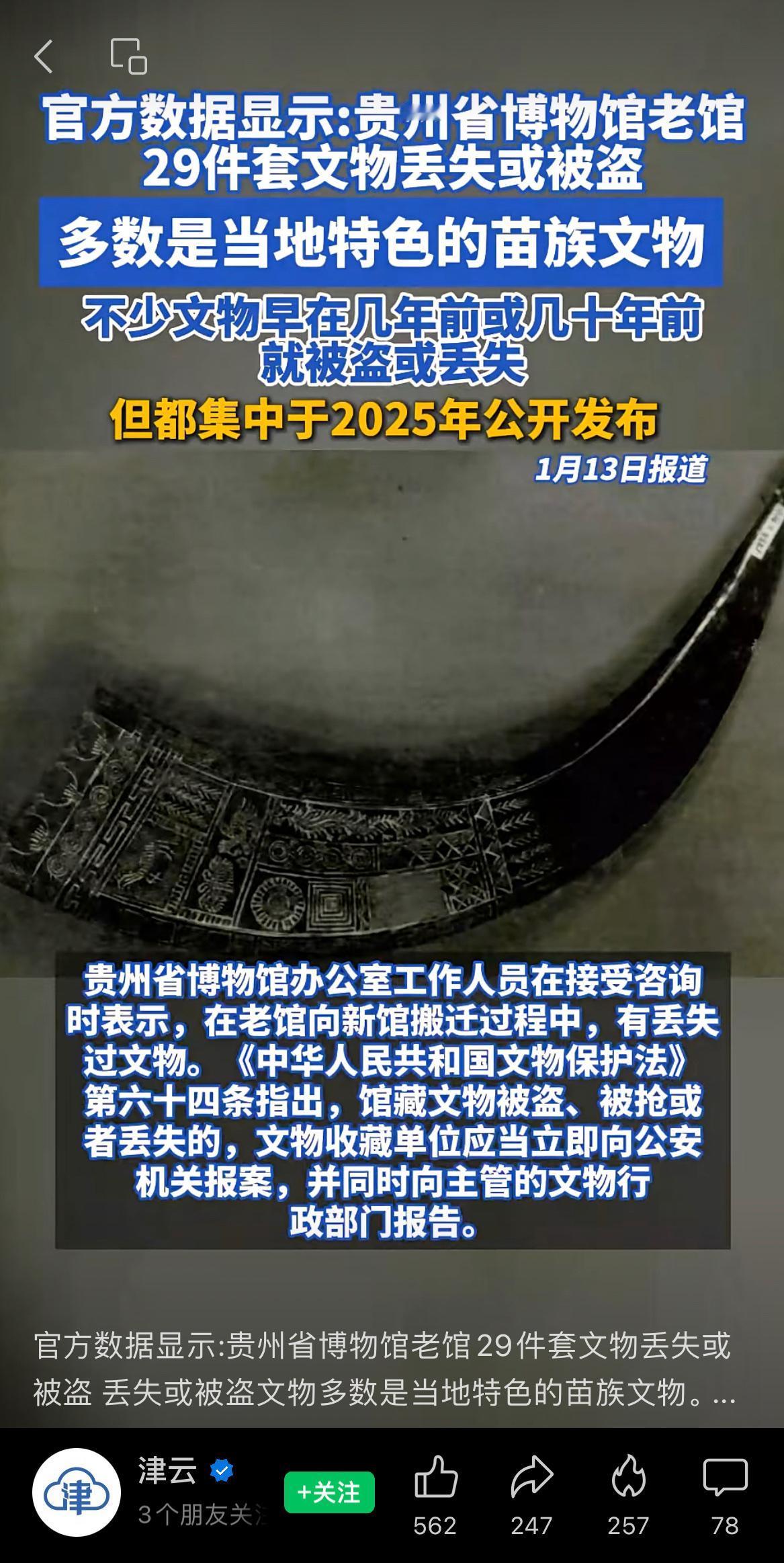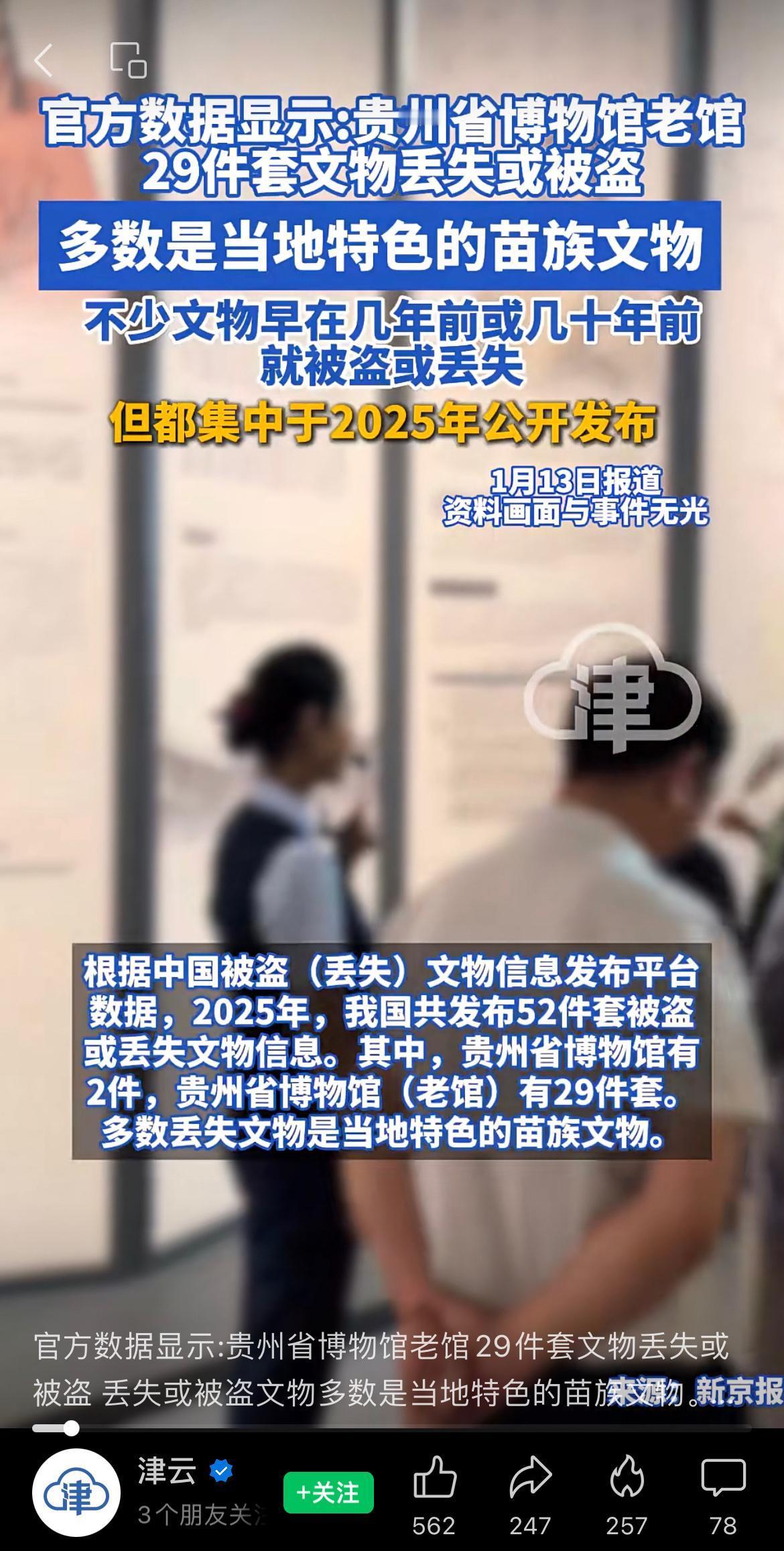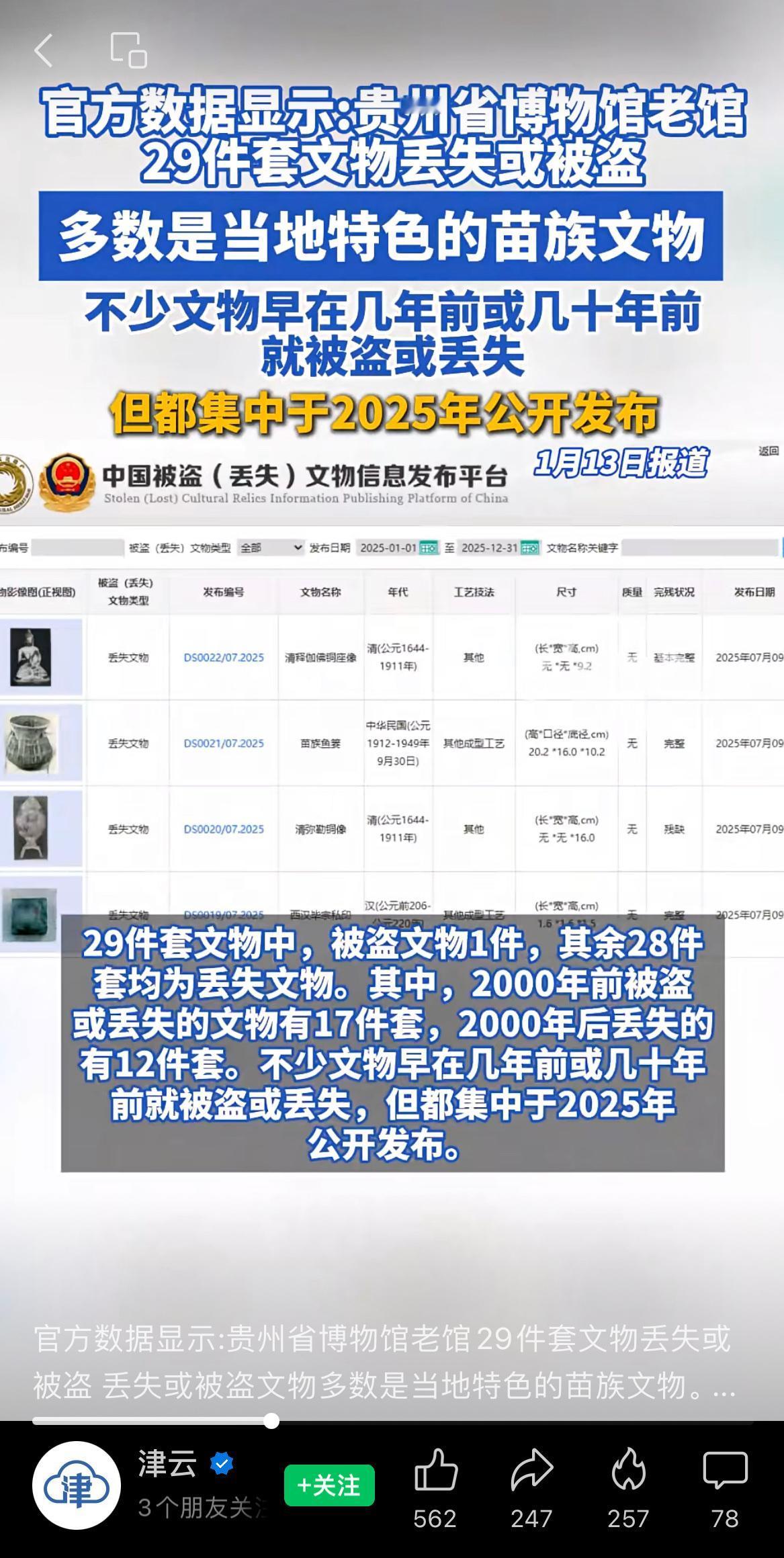 官方数据显示:贵州省博物馆老馆29件套文物丢失或被盗。 丢失或被盗文物多数是当地特色的苗族文物。 不少文物早在几年前或几十年前就被盗或丢失,但都集中于2025年公开发布。 贵州省博物馆办公室工作人员在接受咨询时表示,在老馆向新馆搬迁过程中,有丢失过文物。 这个大家怎么看呢? 贵州省博物馆 文物 文物丢失