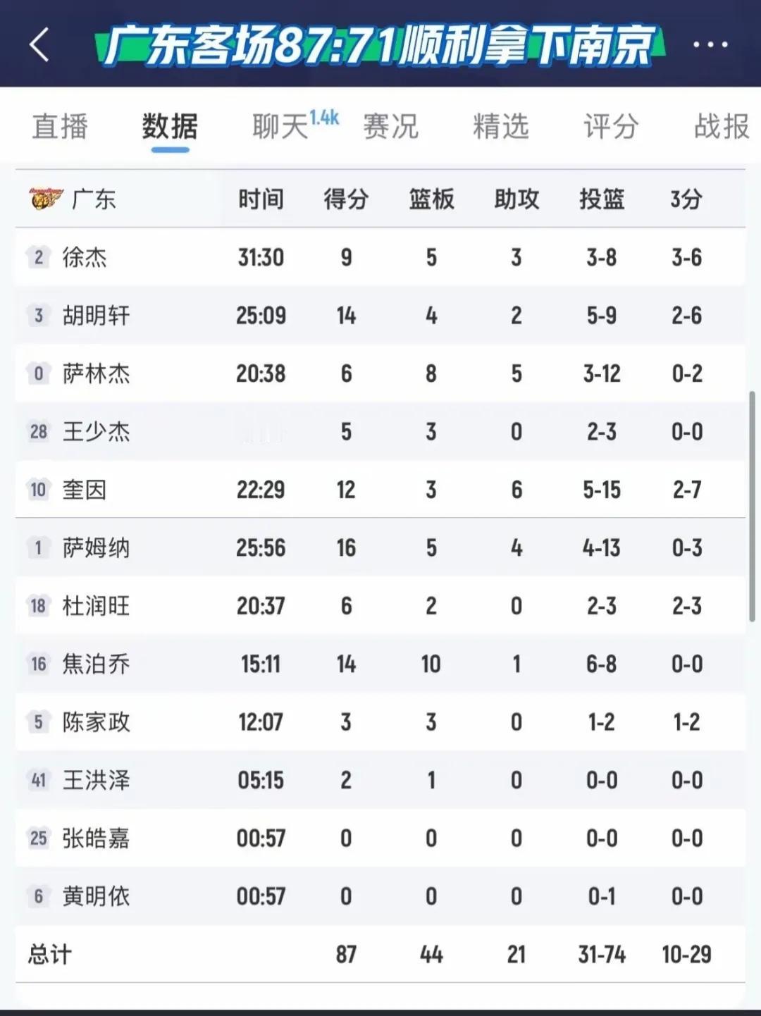广东客场87-71南京。 比赛没有什么好说的,实力摆在那,杜锋主要演练防守战术,已经着眼打上海预演了。 通俗来说就是温水煮青蛙,场面上来讲就是稳扎稳打,循序渐进。武学来说叫见招拆招。 三个内线焦泊乔,王少杰,王洪泽如果能打出来,萨林杰就可以留力打第四节,杜锋强调这场比赛得全队整体配合。