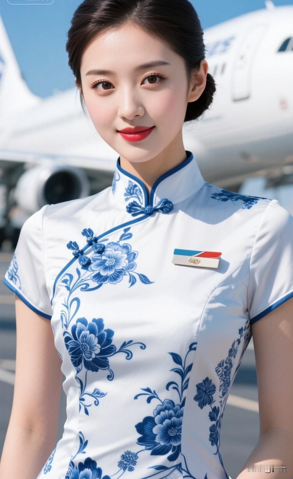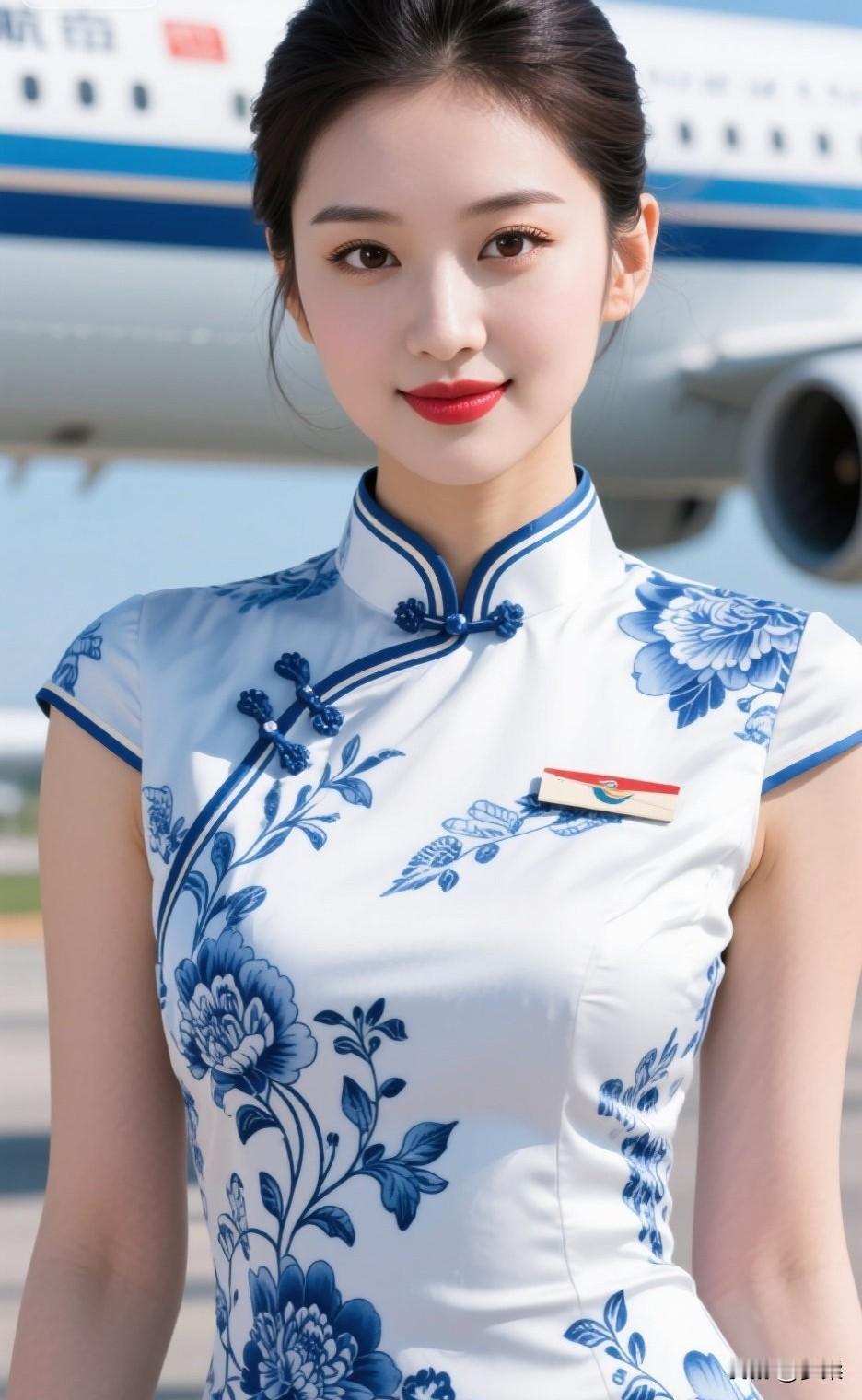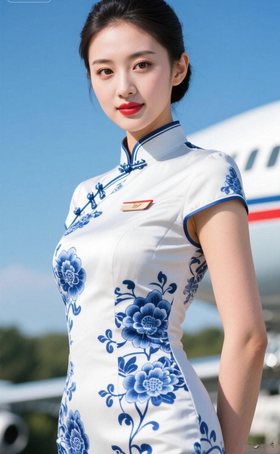 优雅空乘,蓝花旗袍,机场风采空乘工作服 旗袍空姐