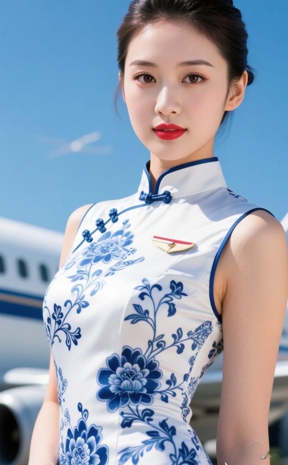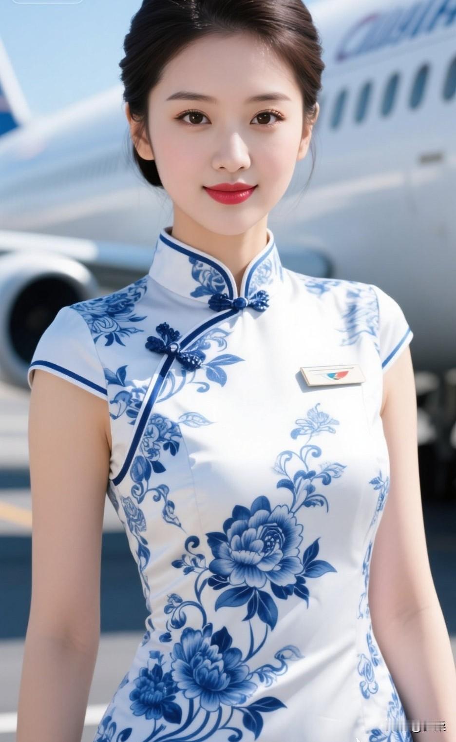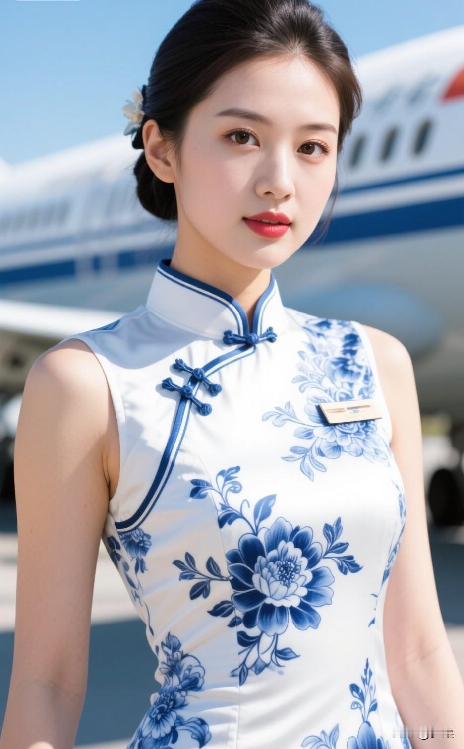 优雅空乘,蓝花旗袍,机场风采空乘工作服 旗袍空姐