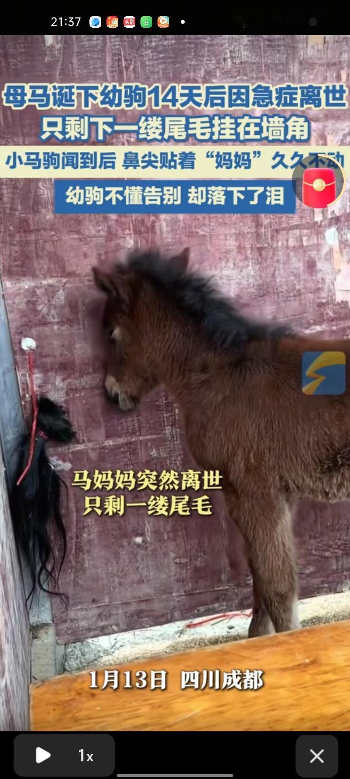 1月11日,四川成都。母马诞下幼驹14天后因急性肠梗阻离世,只剩下一缕尾毛挂在墙角。小马驹闻到后,鼻尖贴着母马久久不动,那时的它不懂“死亡”是什么意思,虽然不会说话,但落下了泪,这让马场工作人员感动到哭了