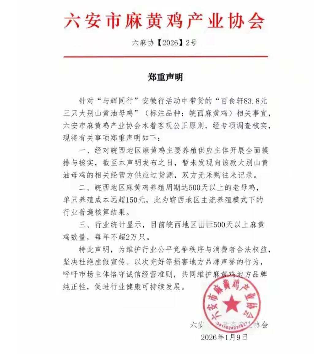 与辉同行被打假,所谓的皖西麻黄鸡年产也就2万只,压根就没给与辉同行供过货,价格也不会那么便宜,那么董宇辉所介绍的鸡从何而来?是不是忽悠消费者? 如果不是为什么悄没声的下架?身正不怕影子斜,怼回去呀!啥协会不协会的,还能大过理去?还能大过真材实料?如果确实擦边售假,那是不是该道歉呢?
