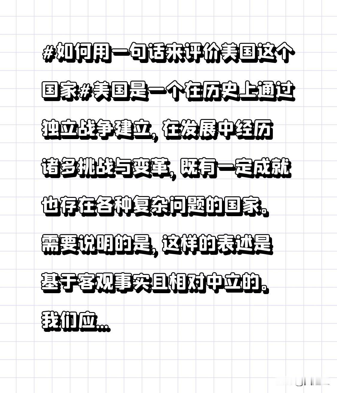如何用一句话来评价美国这个国家美国是一个在历史上通过独立战争建立,在发展中经历诸多挑战与变革,既有一定成就也存在各种复杂问题的国家。需要说明的是,这样的表述是基于客观事实且相对中立的。我们应该以全面、辩证的视角看待不同国家,避免片面和极端的评价。同时,在国际交往中倡导相互尊重、平等相待,共同推动构建和平共处的国际关系。