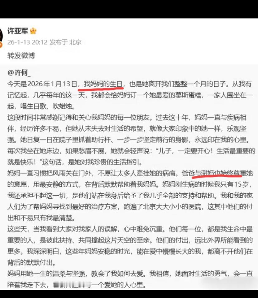 何晴儿子许何在母亲生日这天发文,一边缅怀母亲,一边替许亚军和继母张澍澄清传闻,这操作真让人一言难尽。 距离何晴去世都一个月了,早不澄清晚不澄清,偏挑亲妈生日这天,咋想的呢? 看许何这篇文章中大量笔墨描述许亚军和继母的付出,真的很别扭啊。要知道这日子可是何晴生日,让人家儿子写一篇小作文,只回忆亲妈不行吗? 许亚军更是火速转发微博,这“洗白”操作太刻意了。 虽说孩子可能无心,但背后要说没大人“指导”,鬼都不信。 何晴生日+去世一个月本是她很重要的日子,这下倒好,热度还得分一半给别人,看得人心里真不是滋味。