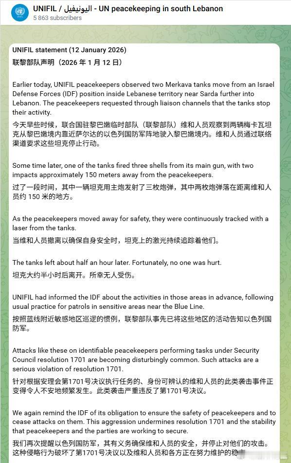 据媒体报道,日前以色列坦克向在黎巴嫩南部执行联合国任务的西班牙维和巡逻队开火。联黎部队发布声明表示,当时联黎部队的维和人员试图阻止两辆以军的梅卡瓦坦克非法进入黎巴嫩境内时遭到对方的攻击。以军坦克一共发射了三枚炮弹,其中有两枚距离维和人员150米左右的距离。 到目前为止,以色列军方和西班牙政府方面还未对此次事件发表任何通告。 来源:UNIFIL