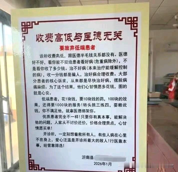 2026年1月12日下午,网传山东沂南一私人中医诊所张贴“放弃低端患者”的不当公告,引发广泛争议。涉事机构为沂南永学中医诊所,其注册名称为沂南肾脏病研究所,负责人王某学因不满部分患者“低消费高要求”,从网上下载相关内容张贴。 沂南县卫生健康局随后发布通报,明确该言论背离“医者仁心”与医德医风要求,对涉事负责人进行约谈批评,责令诊所立即撤除公告并全面整改,同时表示将持续加强对全县医疗机构的教育与监管工作,杜绝此类不当言论和行为再次发生。开办中医诊所 中医诊所收费 中医馆招商 中医馆广告 国医医院转让 广告老中医 郑永新中医诊所 沂南中医 国医馆广告 沂南中医院 中医诊所广告 无照行医 志至中医诊所 新中医诊所 无证开诊所