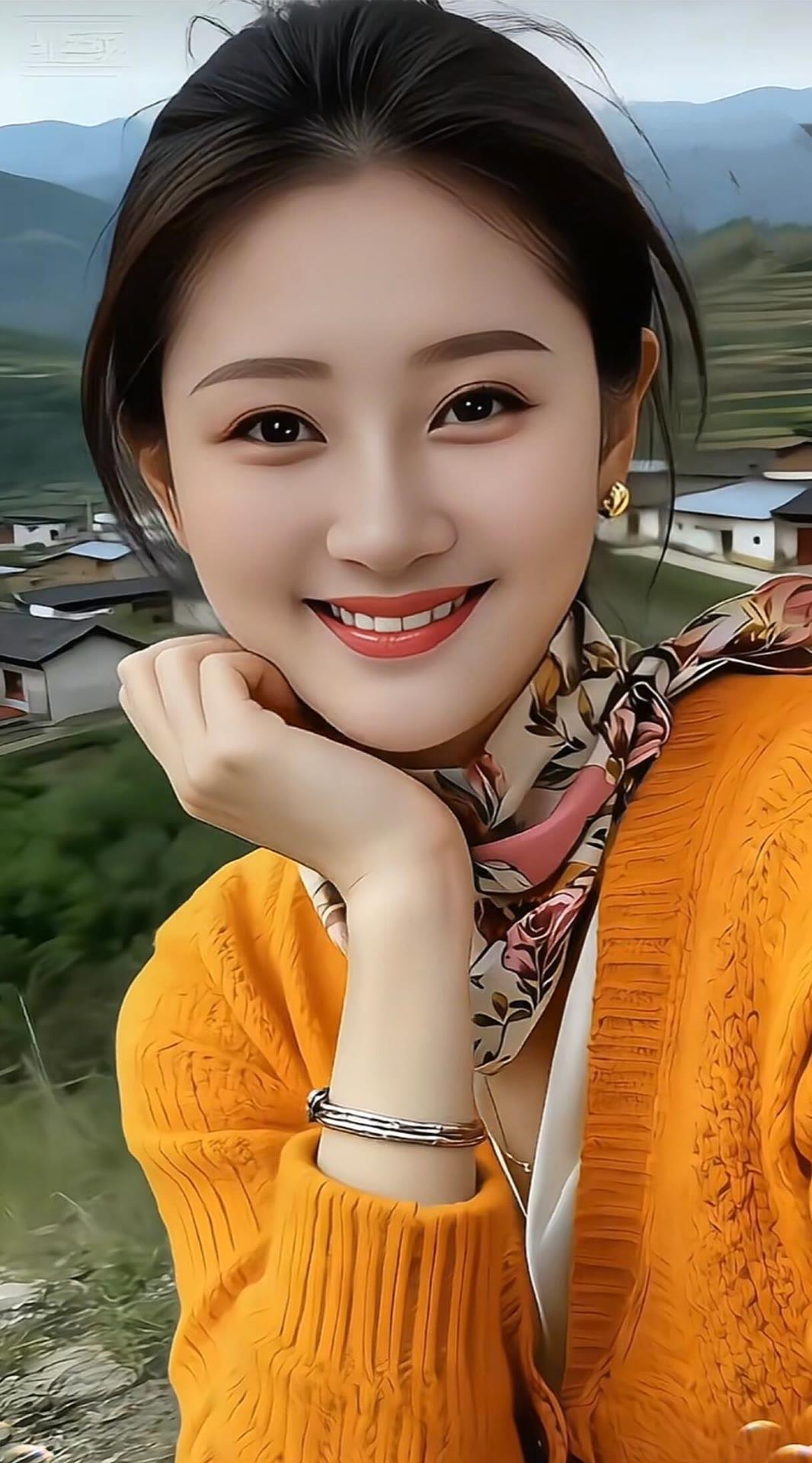 微笑的少女,山间美景相伴,温暖橙衣,幸福满满!🌞🌿💛