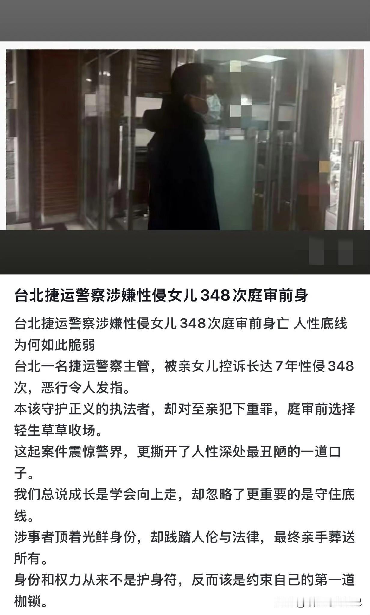 台北一男子涉嫌性侵亲生女儿348次!“狼父”开庭前一夜自缢。这位郑姓捷运(地铁)警察队主管,酒后把魔爪伸向亲生女儿,从2010年到2017年,整整7年、348次。 白天,他站在月台边对旅客微笑宣讲“轨道安全”;夜里,他锁上家门,把亲生女儿拖进轨道尽头的黑暗,反复碾压。 警局里早有风言风语:单独约女警深夜“谈心”、发“我半年没碰太太,你要不要排第一顺位”这种恶心短信,却被“有力人士”压下。 348,每一次都发生在最普通的日常缝隙。是一个小女孩的每一天:写功课时、睡觉时、放学回家开门那一声“爸爸我回来了”时……她得揣着多大恐惧,才能熬到上大学才报警? 报警后她等来的是父亲在开庭前夜“畏罪自缢”。正义还没开口,罪人先逃票,留下女孩永远缺一块的人生。 每次性侵案曝光,总有人问“怎么不早说”。现实是:说之前,她得先打败“他是爸爸”“家丑不可外扬”“报警会毁全家”三座大山。 我们缺的不是受害者的勇气,而是让TA们敢发声的土壤,老师、邻居、同事、警察,只要任何一环肯“多管闲事”,348次伤害就可能归零。 🗣️ 我说完了,轮到你们: “如果当年你是女孩身边的大人,你会怎么做,才能让她少受一次伤?”评论区开麦,别只叹“禽兽”。欢迎大家留言。 (图源网络)