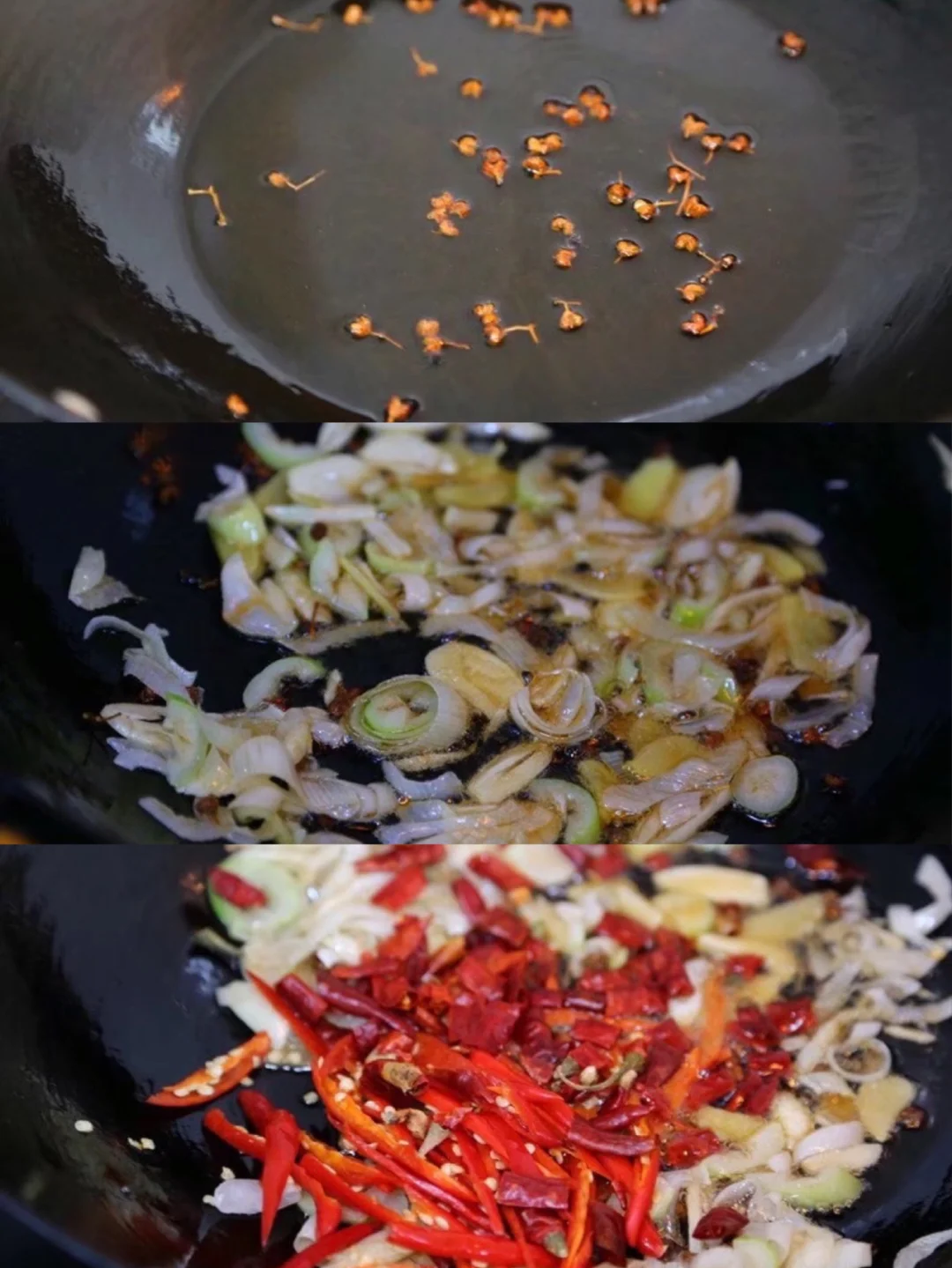 9.炸至金黄色出锅即可 时间太长的话就有糊味儿啦10.锅里少许油,加入一些花椒粒儿小火慢慢爆香11.加入大蒜生姜片大葱段一起慢慢爆香