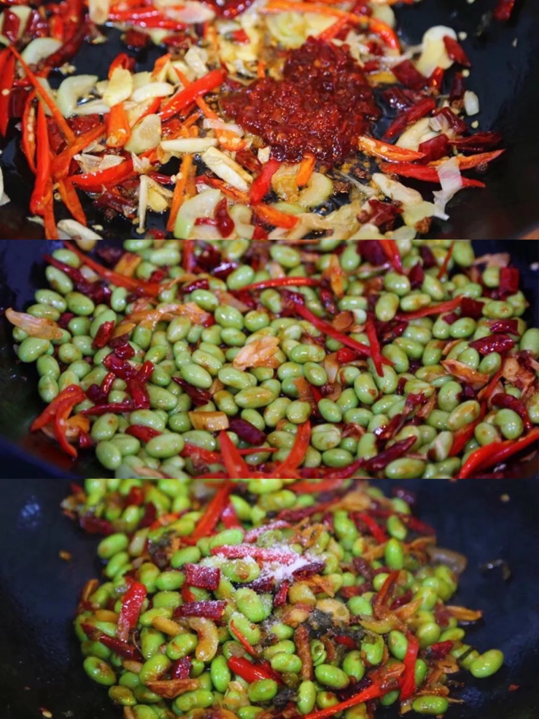 14.煮好沥干水的毛豆米丢进去转大火翻炒