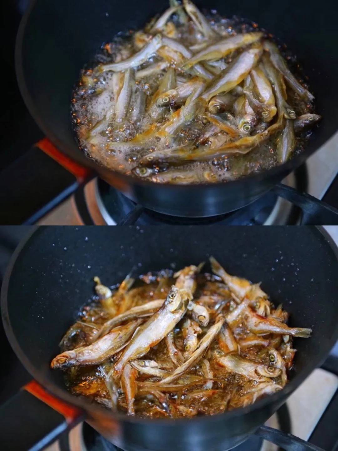 8.现在开始来炸小鱼干 跟你们说哈最好选择这种小口深一些的锅子 这样省油哦 小火慢慢炸哈