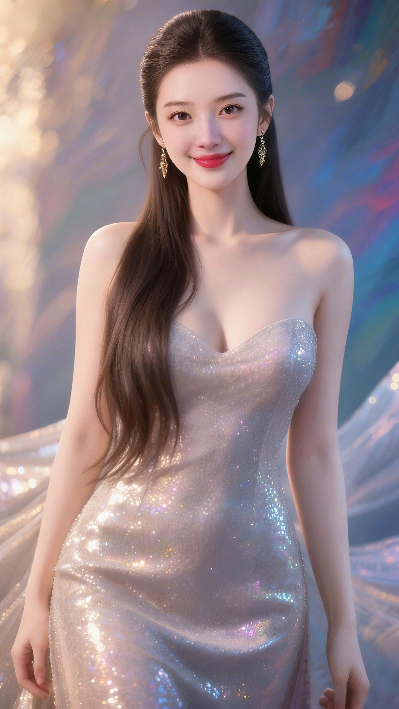 银裙映光漾温柔 幻彩的光影在背景里晕开层层涟漪,像揉碎了的星河坠入人间。一袭银色礼裙缀满细碎闪片,在光线下流转着粼粼光泽,面料的垂坠感衬得身形温婉又优雅。乌黑长发如瀑般垂落,发丝的柔亮与礼裙的璀璨相映,耳间金饰轻晃,似星子坠在耳畔,添了几分精致的韵味。 她的笑绽在唇角,像春日里化开的第一汪清泉,眉眼间的温柔漫溢开来,仿佛能将周遭的喧嚣都化作柔软。原来优雅从不是刻意的修饰,而是由内而外的从容与美好。一袭银裙,一抹浅笑,就让这画面成了时光里的温柔定格,让人忍不住沉醉在这份纯粹的美好中,心底漾起淡淡的暖意,仿佛也触摸到了生活中藏着的细碎浪漫。 银色礼服穿搭 优雅氛围感