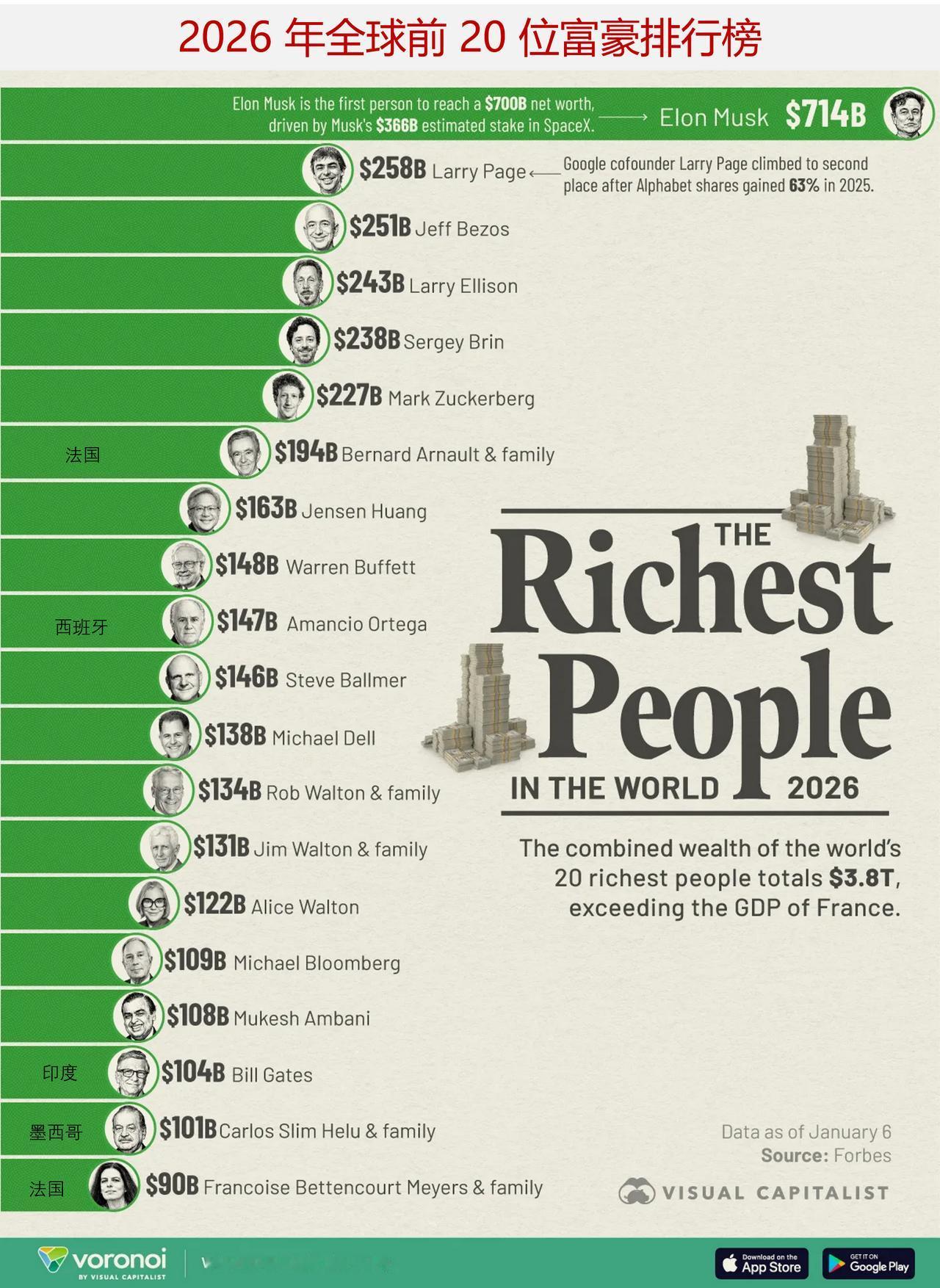 来看看2026 年全球前 20 位富豪排行榜,其中15位是美国人,还有哪些国家的人上榜? 全球前 20 位富豪所拥有的财富——约 3.8 万亿美元——超过了地球大多数国家的国内生产总值。 此外,自 2020 年以来,这些富豪们的财富增长速度惊人。当时,杰夫·贝索斯是全球首富,其净资产达 1450 亿美元。而如今,埃隆·马斯克的财富几乎是这个数字的五倍。 埃隆·马斯克目前拥有 7142 亿美元的财富,他是历史上首位财富突破 7000 亿美元大关的人。 自 2020 年以来,马斯克的财富增长速度惊人,增长幅度接近 30 倍。马斯克最大的财富来源之一是他持有的价值 3660 亿美元的太空探索技术公司股份,目前该公司的市值已达 8000 亿美元。到 2026 年,其市值有可能在一次大规模首次公开募股中攀升至 1.5 万亿美元。 谷歌联合创始人拉里·佩奇排名第二,其净资产达 2577 亿美元。2025 年,Alphabet 股票大幅上涨 63%,这显著增加了佩奇的财富。 如我们所见,英伟达公司首席执行官黄仁勋拥有 1625 亿美元的财富,在全球排名第八。在过去七年里,英伟达的股票价格飙升了超过 4200%,使得黄仁勋成为全球前 20 位亿万富翁中财富增长速度最快的之一。 相比之下,比尔·盖茨的财富自 2020 年以来几乎没有变化。那一年,盖茨是全球第二富有的人,但此后已降至第 18 位。这主要是因为盖茨将数十亿美元捐赠给了比尔和梅琳达·盖茨基金会以及与慈善相关的事业。