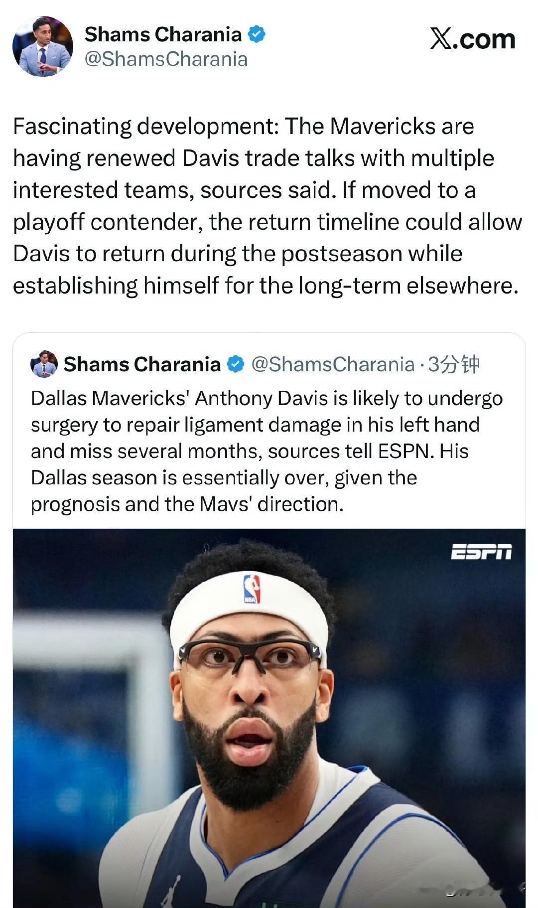 浓眉在独行侠的生涯结束!!!浓眉大概率接受左手韧带损伤修复手术,缺阵数月! 根据记者Shams最新消息透露,独行侠全明星内线安东尼-戴维斯大概率将接受左手韧带损伤修复手术,预计缺阵长达数月。 其实选择手术也挺好,这样也可以让浓眉的球迷彻底清醒,彻底放弃对他本赛季的期望,毕竟这也是他的基本常态了。 如果他最终选择了手术,那么他还是有希望在季后赛的时间段回归的,但是前提是他的球队可以进入季后赛,所以浓眉可以和独行侠说再见了,他在达拉斯的生涯结束了,尽管他还没有为这里的球迷打过几场比赛,但是独行侠的未来规划里已经没有他的位置。 因此,浓眉的事件有了新的进展,独行侠重新将浓眉摆上货架,他们已经开始和各支球队重启交易谈判,争取在交易截止日前送走他,这样他还有机会重返季后赛。 希望浓眉早日康复,不过无论如何不要对这个浓眉抱有太大期待了。 戴维斯 浓眉哥 浓眉