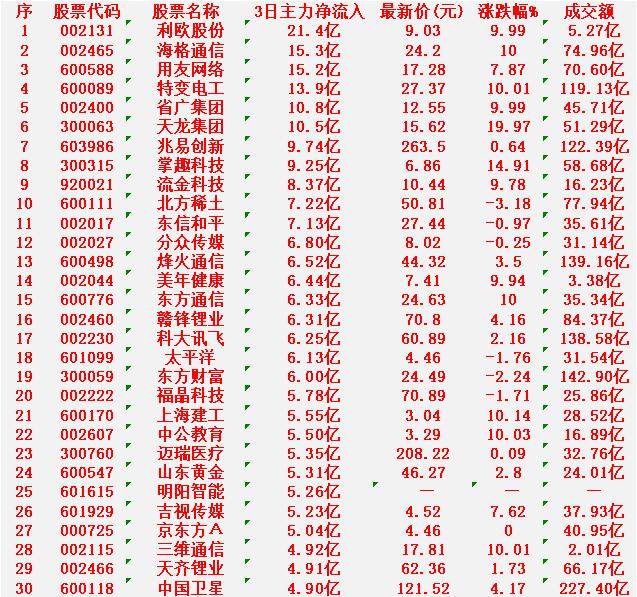 1月14日,前3天主力大幅买入的30名单! 利欧股份:3日净流入 21.4亿元,最新价 9.03元,成交额 5.27亿元 海格通信:3日净流入 15.3亿元,最新价 24.20元,成交额 74.96亿元 用友网络:3日净流入 15.2亿元,最新价 17.28元,成交额 70.60亿元 特变电工:3日净流入 13.9亿元,最新价 27.37元,成交额 119.13亿元 省广集团:3日净流入 10.8亿元,最新价 12.55元,成交额 45.71亿元 天龙集团:3日净流入 10.5亿元,最新价 15.62元,成交额 51.29亿元 兆易创新:3日净流入 9.74亿元,最新价 263.50元,成交额 122.39亿元 掌趣科技:3日净流入 9.25亿元,最新价 6.86元,成交额 58.68亿元 流金科技:3日净流入 8.37亿元,最新价 10.44元,成交额 16.23亿元 北方稀土:3日净流入 7.22亿元,最新价 50.81元,成交额 77.94亿元