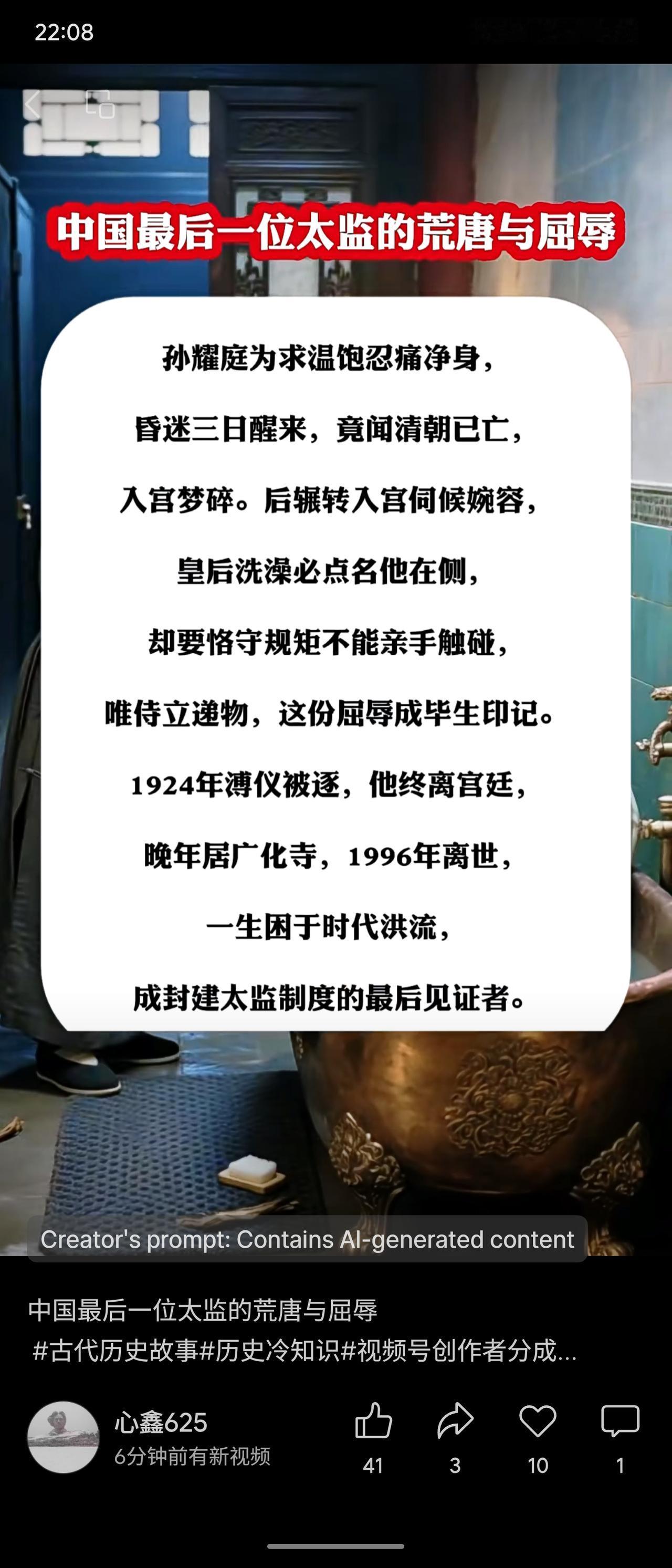 孙耀庭为入宫净身,醒来清朝已亡。后仍侍奉皇后婉容,承受侍浴时仅能递物、不可触碰的屈辱。溥仪被逐后离宫,晚年居寺中,作为末代太监见证了封建制度的终结。