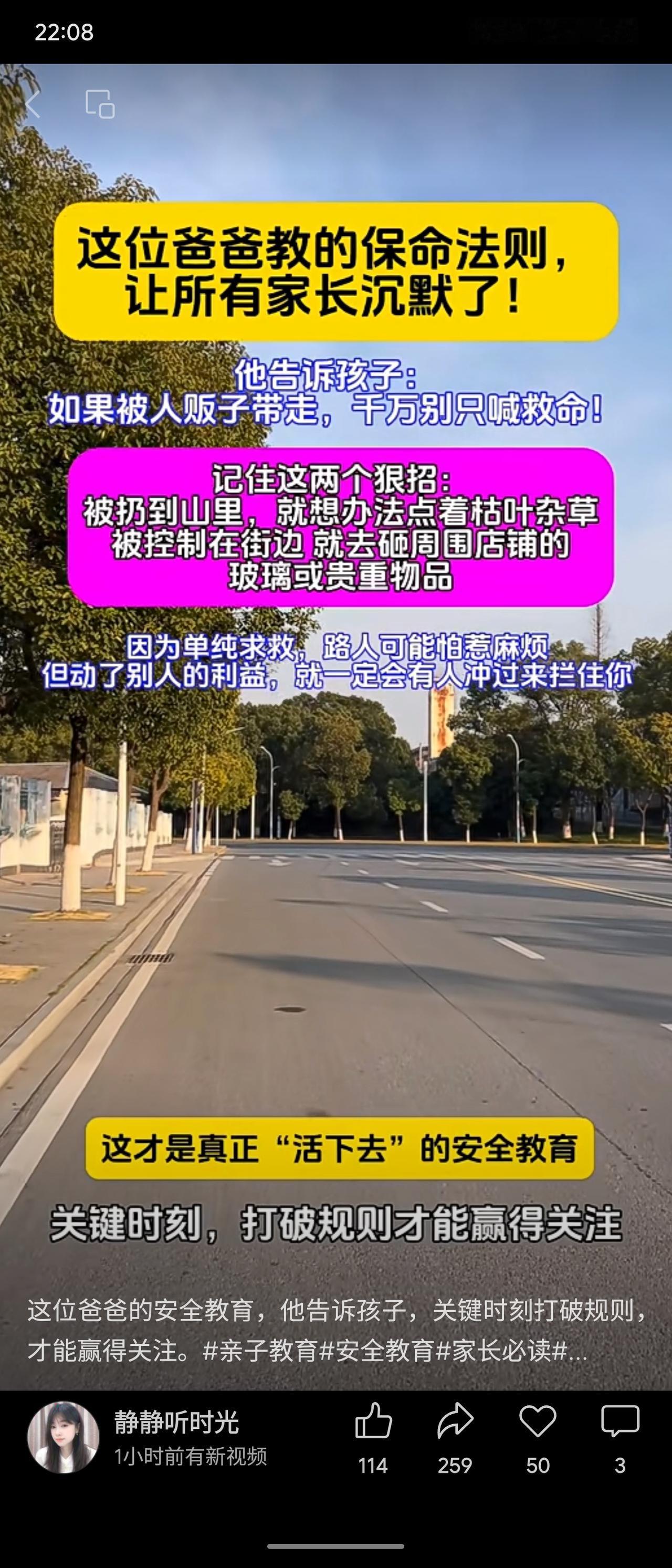 一位父亲教孩子被拐自救法:若在山中则点燃枯叶杂草,若在街边则砸店铺玻璃或贵重物品。因触动他人利益必会引来干预,单纯呼救可能被忽视。强调危急时需打破常规以获救。