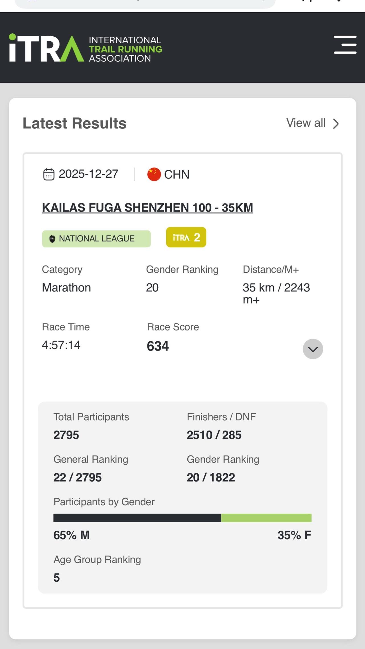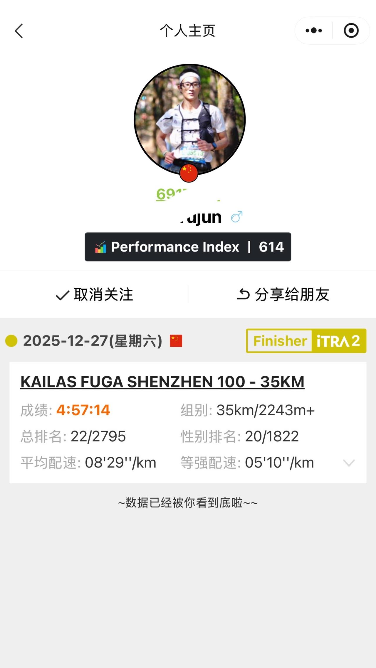 深圳100越野赛出分,首野表现分614,单场634分,越野跑比路跑更有意思,今年有机会多跑跑山吧,看看有没有机会涨到700分,以前爬了那么多山,还是有点底子的。深圳100越野赛 越野跑 深圳户外 深圳爬山