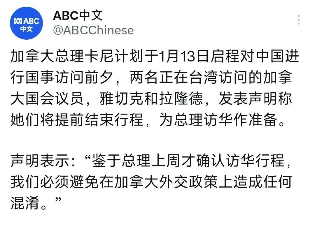 加总理准备访华,加议员却急忙从台湾撤回。 1月13日前夕,两名正在台湾地区访问的加拿大国会议员雅切克和拉隆德宣布提早返程,理由是要“配合总理出访安排”,并称需要集中精力处理相关准备工作。 她们解释说,若在总理即将进行八年来首次访华之际继续停留台湾,可能在对华政策上制造“信号重叠”,这番说法被视作一次姿态上的快速调整。 从渥太华的算计看,一个是涉台行程的象征意义,一个是与北京对话所牵动的贸易、能源、留学等现实议题,在预算、兵力部署(印太存在)和对华立法等层面,很难两头都硬顶。 有评论就提醒,加方这次“急刹车”,更多像是在测试边界后及时回撤:一方面不愿放弃在台湾问题上表达立场,另一方面又不想让总理访华的气氛被自己人搅乱,这种摇摆本身就是政治信号。 在你看来,这类先试探再回调的外交操作,更像是务实调整,还是短线投机?如果其他中等国家在大国博弈夹缝中也频繁上演类似动作,你更关心的是经贸机会,还是长期安全环境?