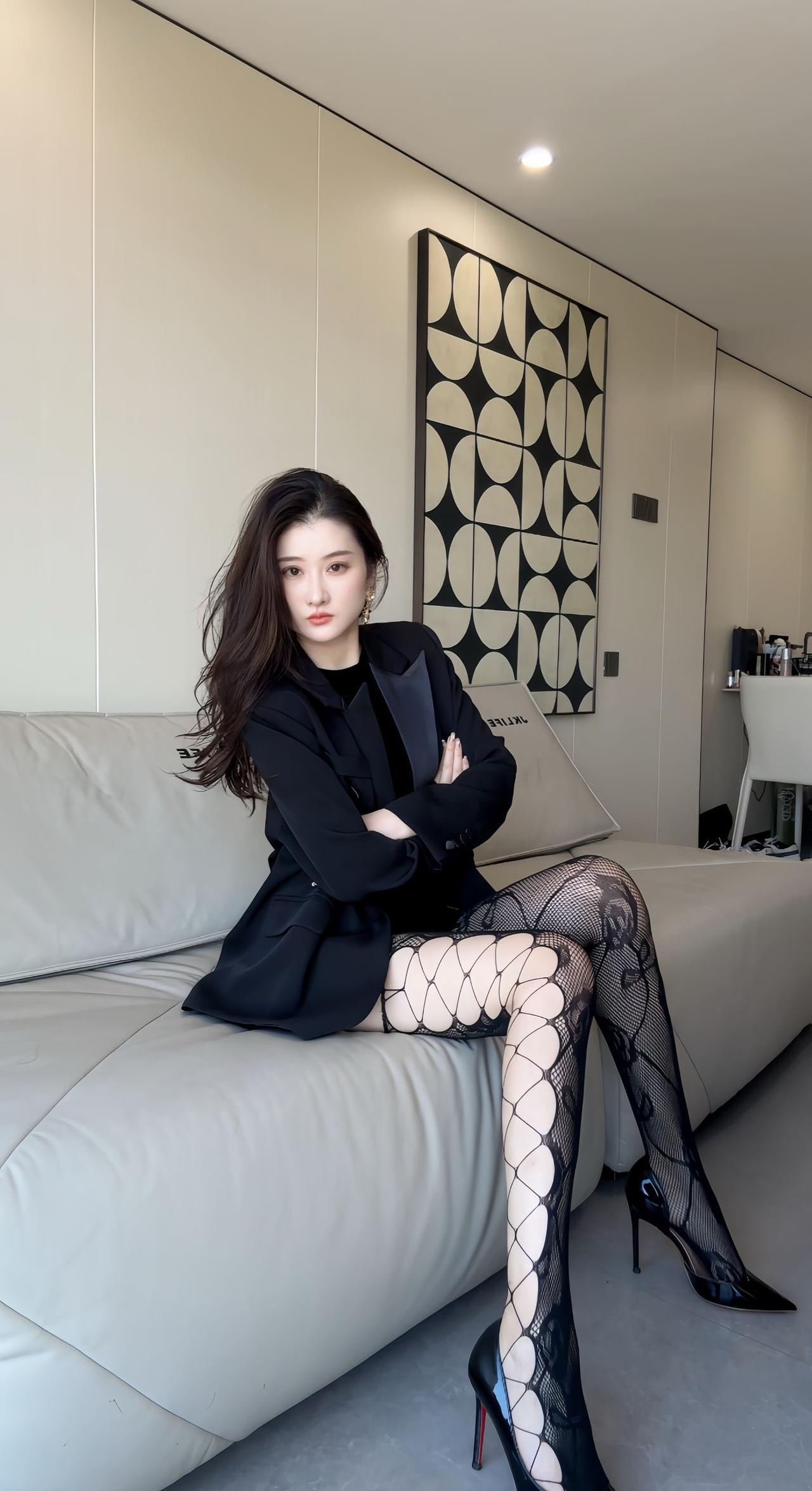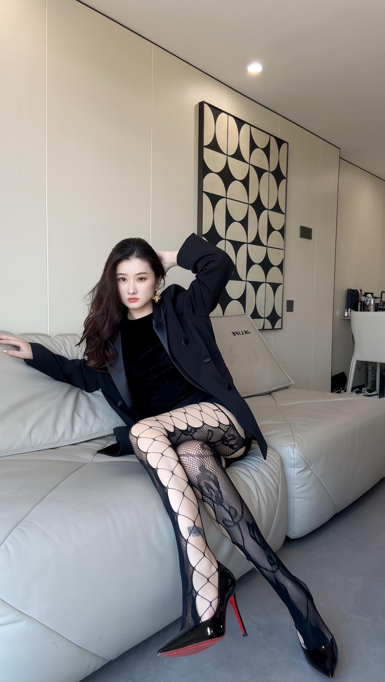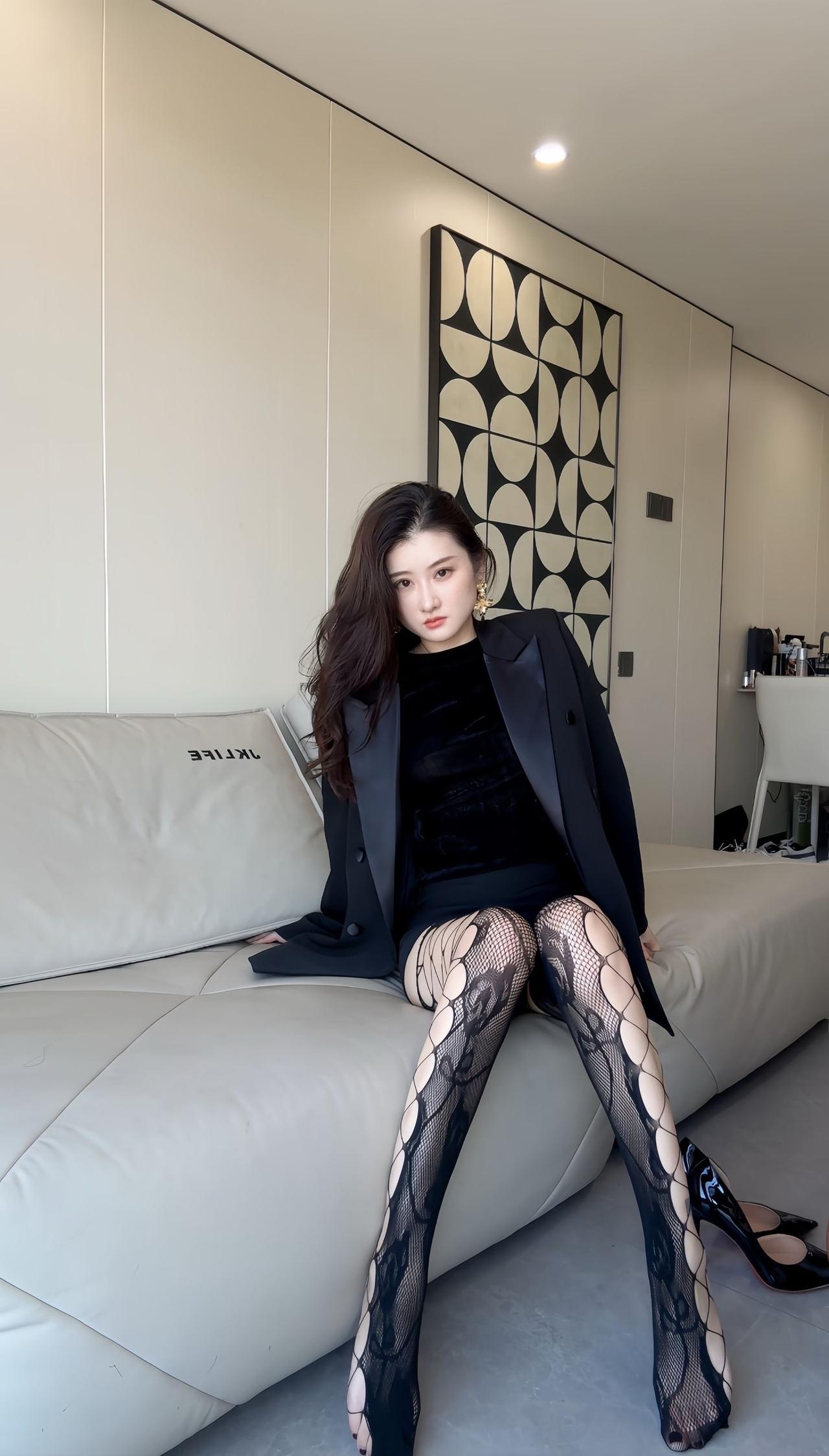 都市女郎的优雅穿搭,黑色西装搭配透视蕾丝袜,尽显时尚魅力!