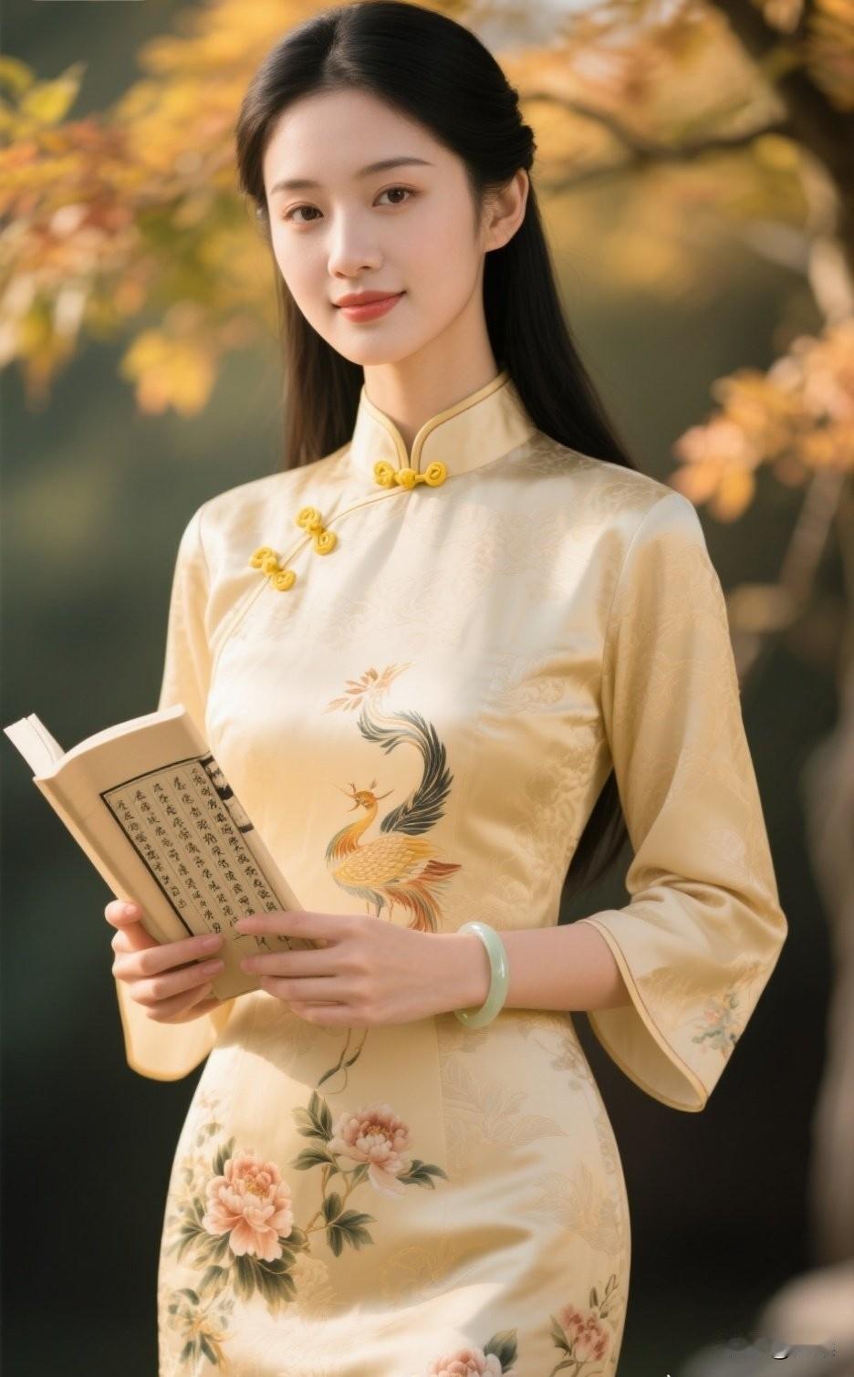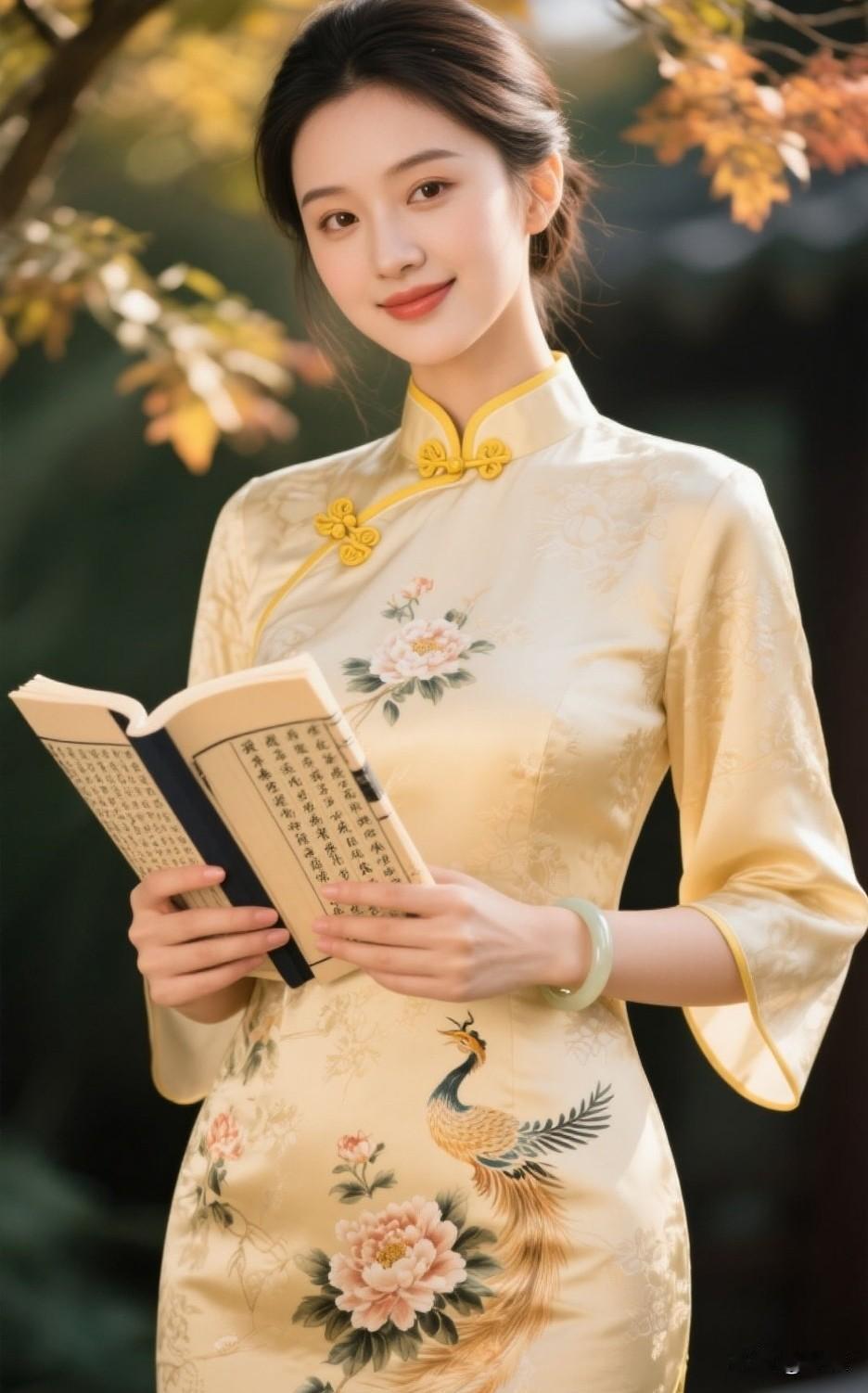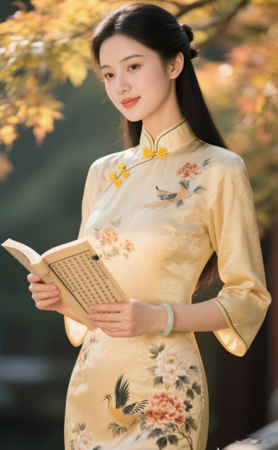 秋日暖阳下,优雅旗袍少女手持古书,尽显古典韵味。旗袍古典美女 旗袍少女照 旗袍女