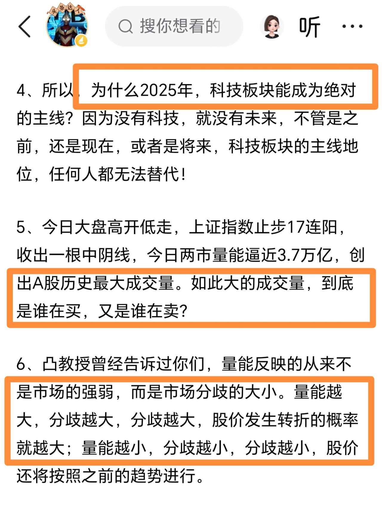 干就完了!凸教授深夜发文,不要担心成交量创新高,成交量大说明市场分歧大,说明有人买有人卖,股价发生反转的概率就大,如果成交量小的话,那么市场趋势就会一成不变。凸教授还强调,科技依然是今年的主线,短期内科技主线无法替代!
