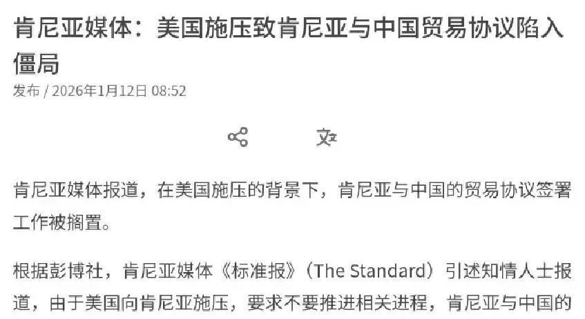 美国开始绕过中国本土,对合作伙伴下棋。 肯尼亚谈判代表承认,和中国的贸易协议“卡在外部因素”,时间点又刚好对上美国表达关切的阶段。 在内罗毕港口、关税表和农产品配额之间,美国更像是在提示:要么调整和中国的合作节奏,要么承担金融、援助等方面的不确定。 有人评价这是“变相围堵”,但也有非洲学者提醒,美国还在该地区投入安全合作和基建资金,肯尼亚不会轻易牺牲多方平衡。 中国此前取消部分农产品订单、制裁美国军工企业,被不少分析视作“在贸易和军售之间对表态”,但影响规模还要看未来国会授权和企业订单。 如果美国进一步把压力扩散到更多中小经济体,中国、这些国家以及美国自己,谁会先评估成本重新收手?你更关心的是:小国在大国博弈里,有没有现实可行的“第三条路”?