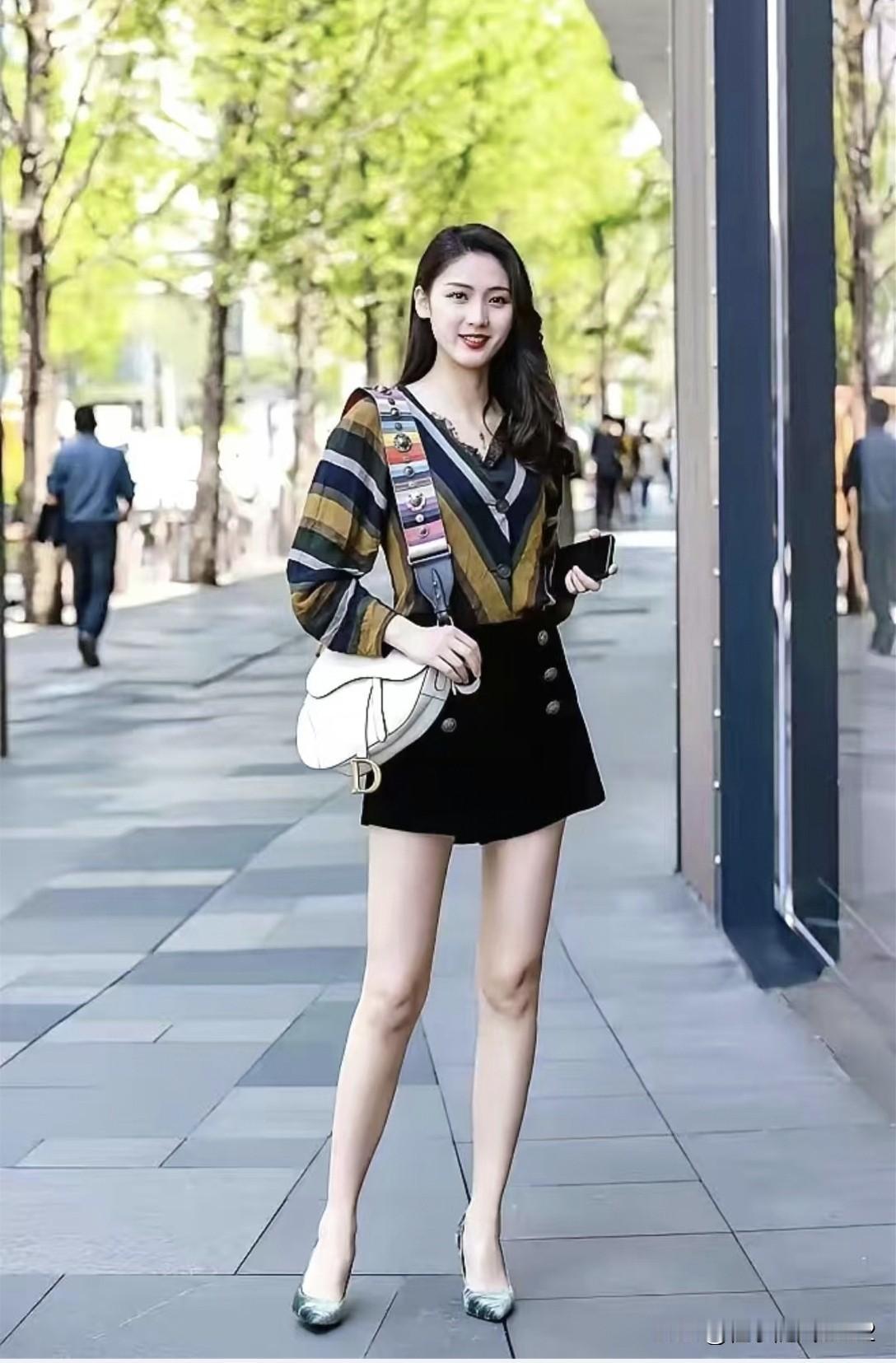 时尚都市风,黑白条纹裙搭配彩色毛衣,轻松出街
