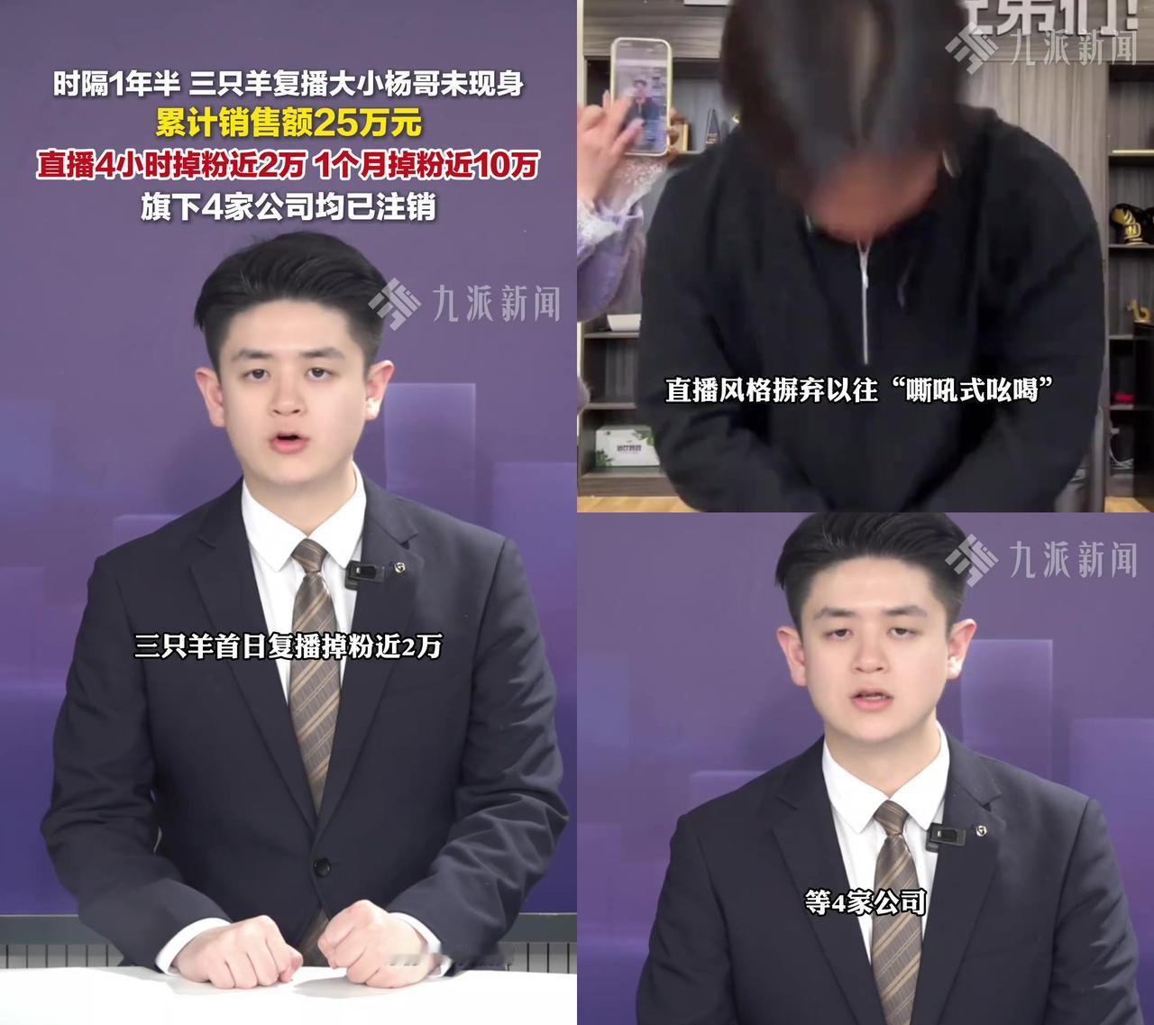三只羊停播1年半复播,4小时掉粉近2万,销售额才25万。 之前因虚假宣传罚了近亿,现在复播了,旗下4家子公司却全注销了。对比东北雨姐,同样卖假,雨姐被封超1年连小号都活不了,三只羊咋就能正大光明开直播? 有人说三只羊整改配合,交了巨额罚款;可雨姐也罚了啊,为啥待遇差这么多?是合肥的纳税大户更金贵?还是数万就业岗位的牌面比普通人的信任重要? 之前喊着“家人们”割韭菜的大小杨哥没现身,现在直播间冷清得像被弃的菜市场,这就是观众给的答案:你犯了错,不是交了钱就能当没事发生。 别扯什么合规性,大家质疑的从来不是流程,是“凭啥你能上我不能”的双标。东北雨姐的粉丝冤吗?冤的是连改正的机会都没有;三只羊的复播惨吗?惨的是观众已经不买账了。 所谓的差别待遇,不过是资本和流量的游戏,可观众的眼睛,比任何关系都亮。