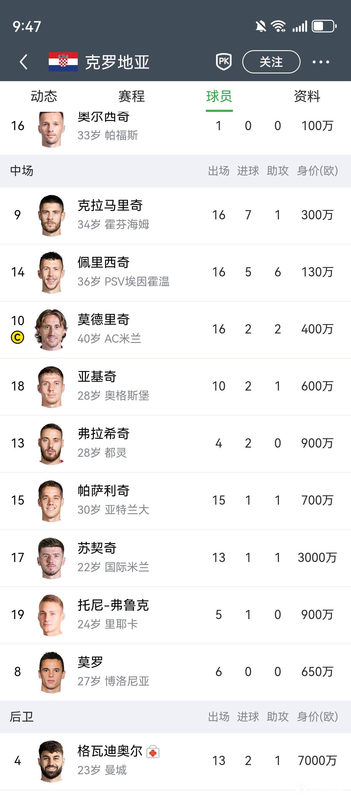年轻真好,克罗地亚中场身价最高,苏契奇3000万欧元。 他在国际米兰效力才22岁,出场时间并不多。 莫德里奇在AC米兰都是核心,只剩400万身价。 未来就是年轻人的,他要是国米主力得涨到6000万。[大金牙]