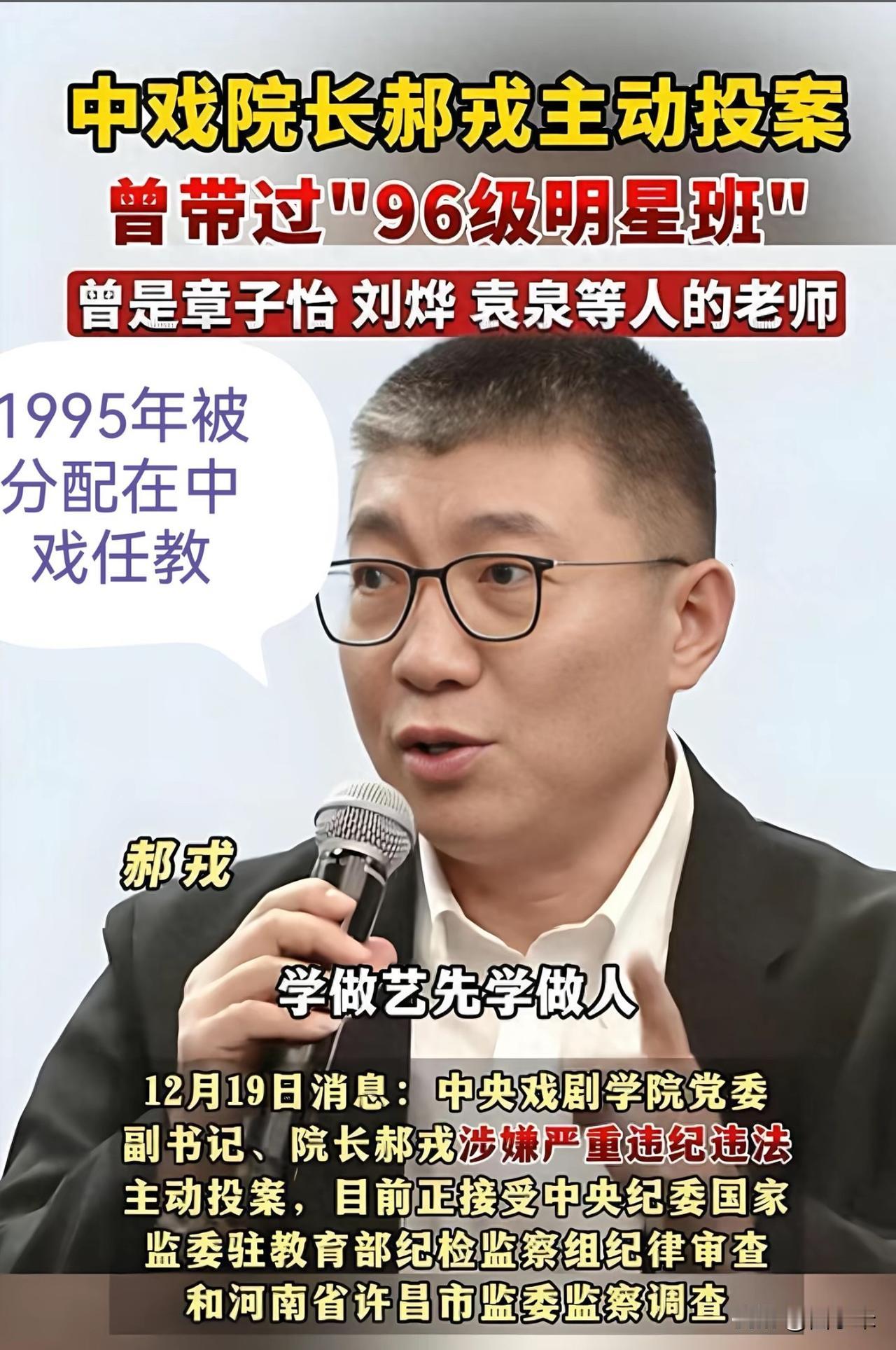 一觉醒来! 中央戏剧学院院长郝戎投案自首,这事儿引起了公众很大的关注,毕竟中戏可是咱们国内最顶尖的戏曲院校,培养了无数优秀的演员。 可是这回是坏事儿了,众多网友却将目光放在了中戏的入学问题上。 中央戏剧学院,直译为Central Academy of Drama,是东方大国最高学府之一的戏曲院校,培养了梅兰芳、尚小云等艺术巨匠,近年来更是培养了张国荣、巩俐、刘烨等影视巨星。 郝戎投案自首,是不是“酸黄瓜”之子也被中戏录取了呢? 中戏近日正好在进行教育部专项检查,自查了不少问题,是主动交代问题,还是掩盖事实呢? 教育公平,是社会公平的基础。 作为知名院校,更应该坚守底线,不得以任何理由违反招生规定。 如果中戏真的存在违规操作,弄虚作假,欺骗招生委员会的行为,那就必须严惩不贷,以维护公众的知情权和监督权,以回应社会对教育公平的期待和要求。 相关部门称,一定依法依规处理,不枉不纵,不死不息,不避不挡。 我们期待彻查到底,彻底查清中戏的招生问题和潜规则,以确保教育环境的公平公正,让真正有才华的人有机会发光发亮。