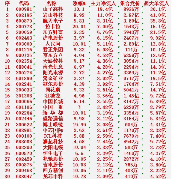 1月14日开盘45分钟,主力资金“买入的 ”的30名单一览! 山子高科:净流入 19.4亿元 岩山科技:净流入 11.0亿元 航天电子:净流入 8.31亿元 拉卡拉:净流入 7.00亿元 东方财富:净流入 6.76亿元