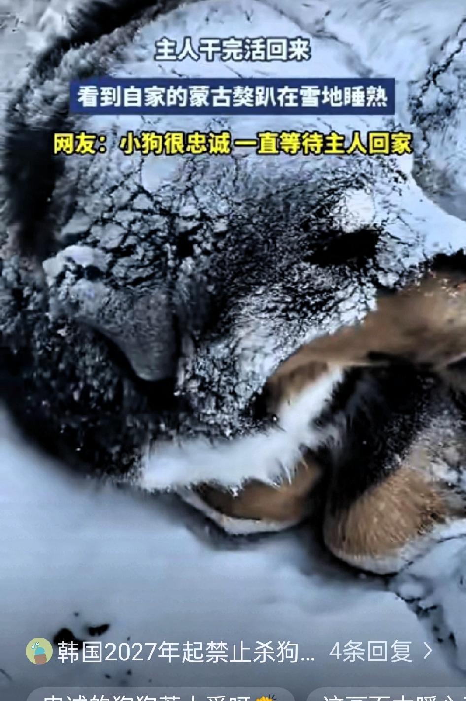 “泪目了!”内蒙古,一女子干完农活回家,发现自己养的蒙古獒没有出来迎接,走近才发现,原来是为了等主人,浑身积雪也不愿进屋 内蒙古王女士干完一天农活,拖着疲惫的身躯往家赶。天色渐暗,雪花簌簌飘落,寒风刮得人脖子发紧,她下意识紧了紧围巾,心里还想着,往常这个时候,自家的蒙古獒早就颠儿颠儿跑出来迎接了。 可今天走到家门口,却没看到那熟悉的身影。王女士心里犯嘀咕,寻思着或许是天冷,狗狗躲在屋里取暖了。可刚走近院门,就看到雪地里蜷缩着一团黑乎乎的东西,她定睛一看,瞬间红了眼眶——那正是自家的蒙古獒!狗狗身上盖着厚厚的积雪,只露出一小撮黑毛,显然是在雪地里守了许久,困得睡着了。 王女士赶紧上前轻轻叫醒它,狗狗迷迷糊糊抬起头,看清是主人后,立马精神了,“嗖”地一下站起来,使劲抖落身上的雪沫子,尾巴摇得像小马达,一个劲儿往王女士身上蹭。王女士心疼地帮它拍掉毛发里的雪,鼻头一阵发酸。 都说蒙古獒一生只认一个主人,这话真的一点不假。它们的忠诚从不是挂在嘴边的空话,而是风雪里的默默坚守,是哪怕冻得打哆嗦,也要守在门口等主人回家的执着。在狗狗的世界里,主人就是它的全世界,你给它一碗饭、一个遮风挡雨的家,它就愿意用一辈子来陪伴和守护。 这份不带任何功利的纯粹爱意,比很多虚情假意都来得珍贵。也难怪越来越多人愿意养宠物,因为它们的陪伴,总能在不经意间治愈我们疲惫的生活,带来简单又踏实的温暖。