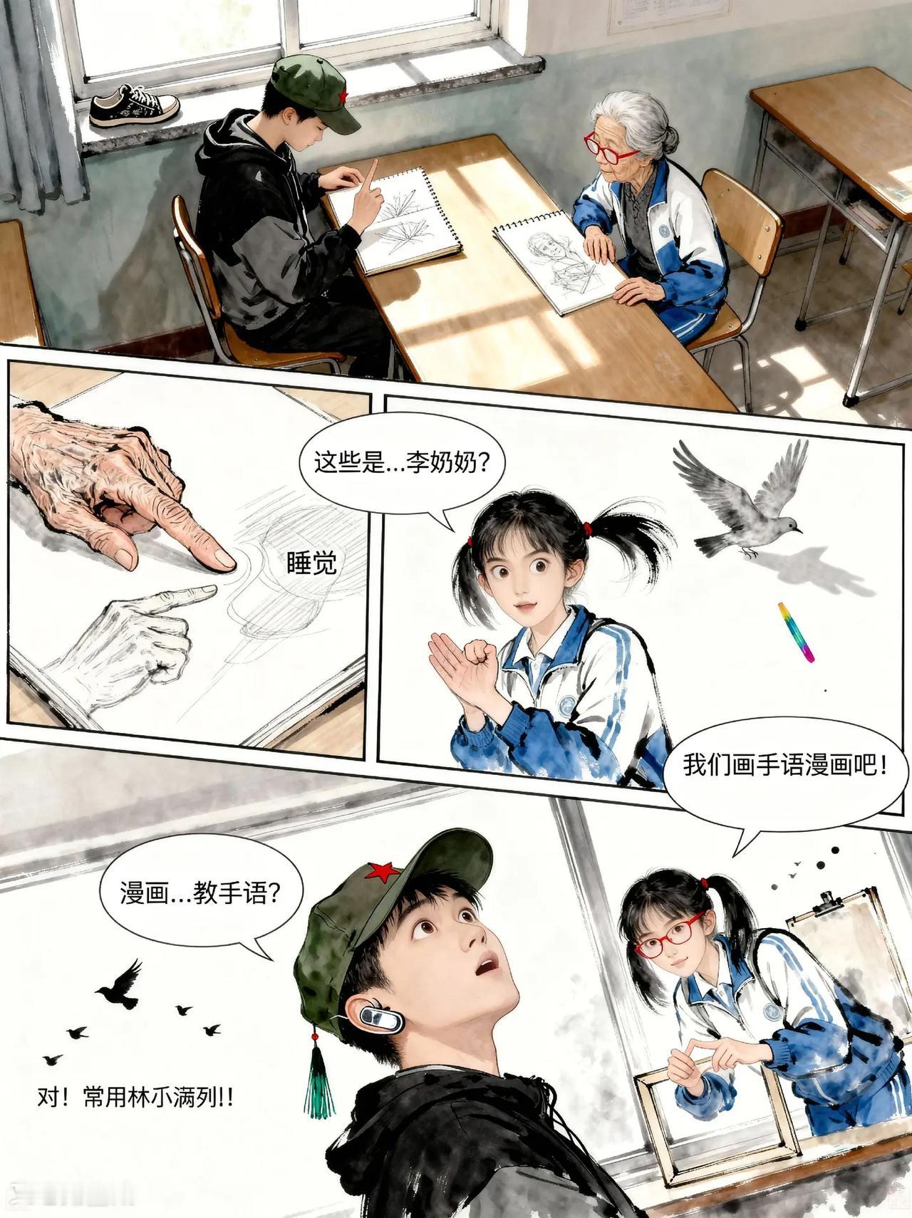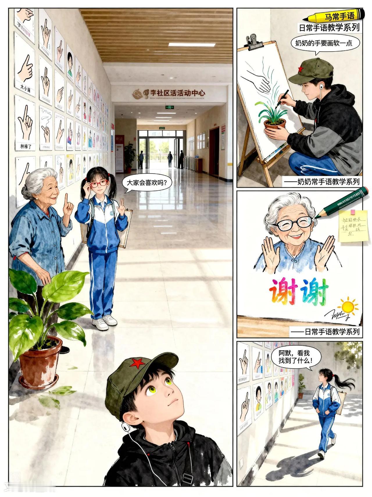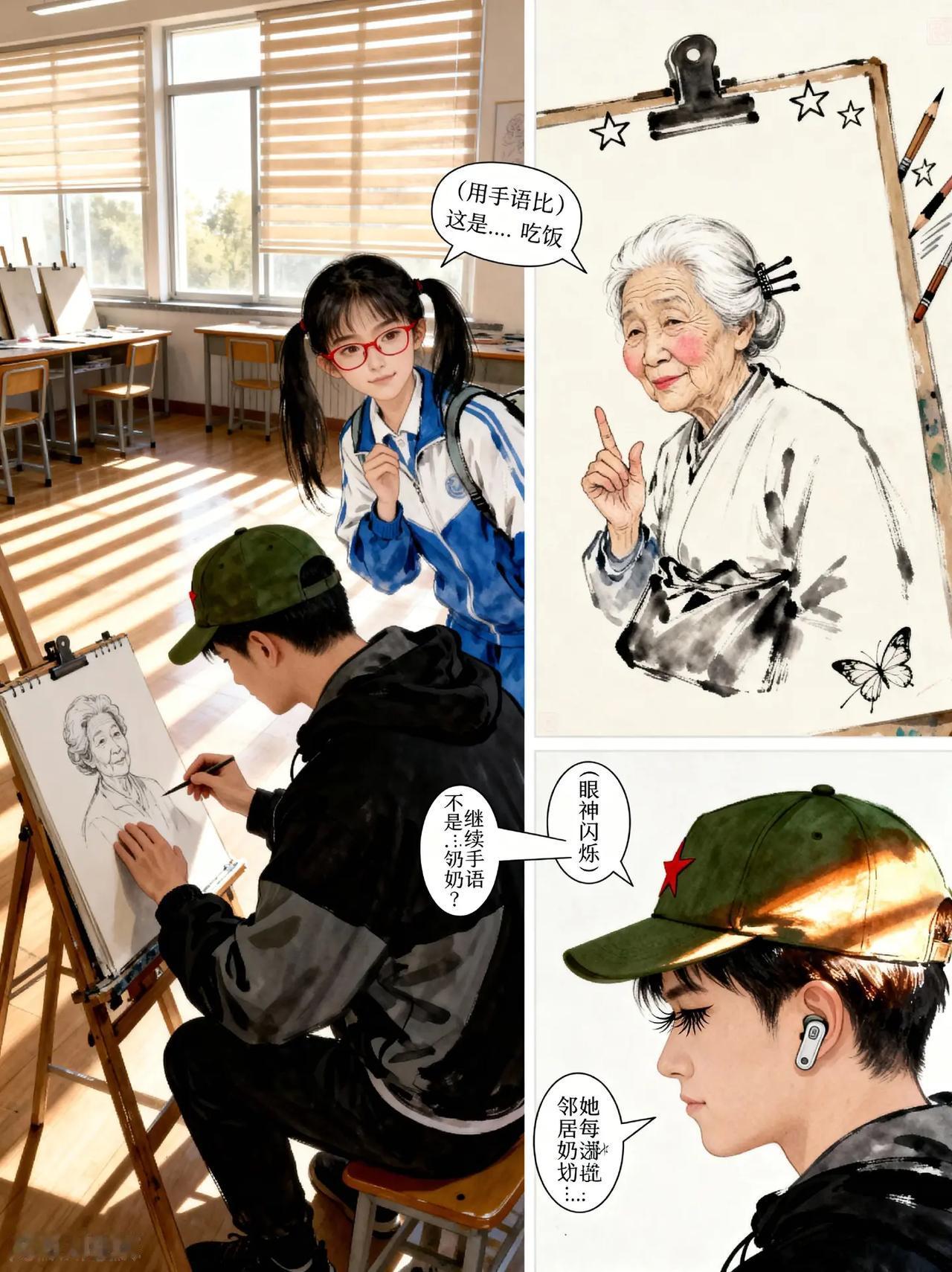 无声的翅膀第3话。故事梗概:听障少年阿默与转学女生林小满,将独居老人李奶奶的日常手语画 成漫画,让孩子们学会用手语与听障老人交流,最终阿默以蝴蝶翅膀装饰帽子 纪念这份无声的连接。热门 漫画 上热搜 热点
