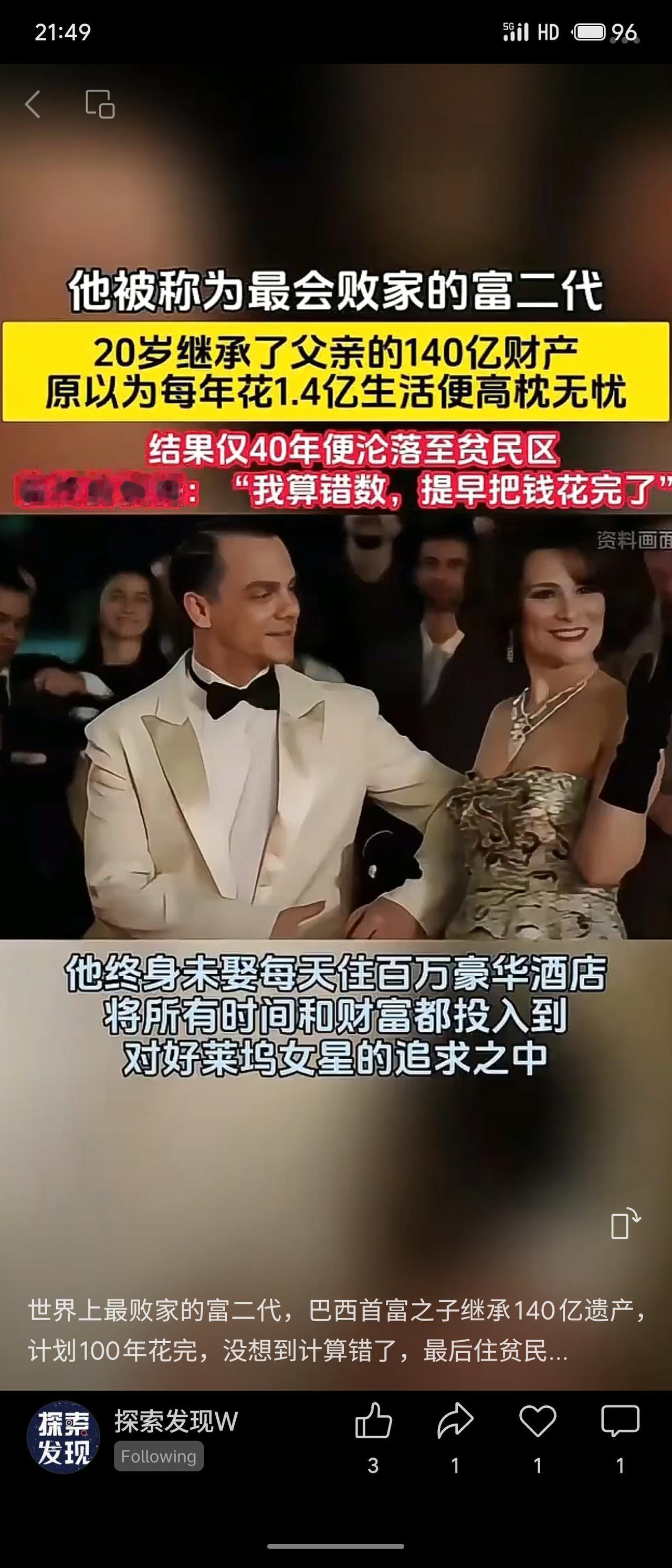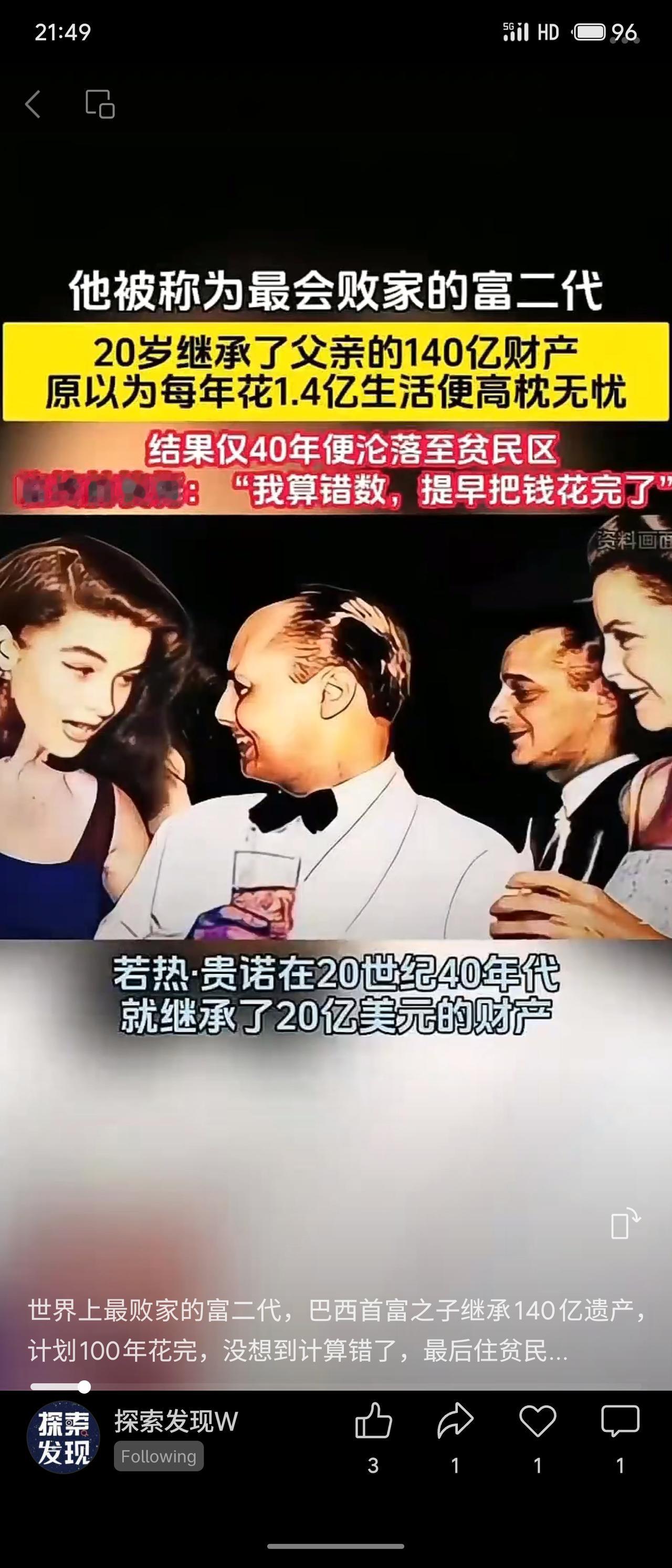 巴西富二代若热·贵诺20岁继承巨额遗产,计划每年花1.4亿享乐百年。但因挥霍无度且家族企业破产,仅40年便耗尽财富,晚年沦落贫民区靠救济金生活,临终懊悔“算错了”。