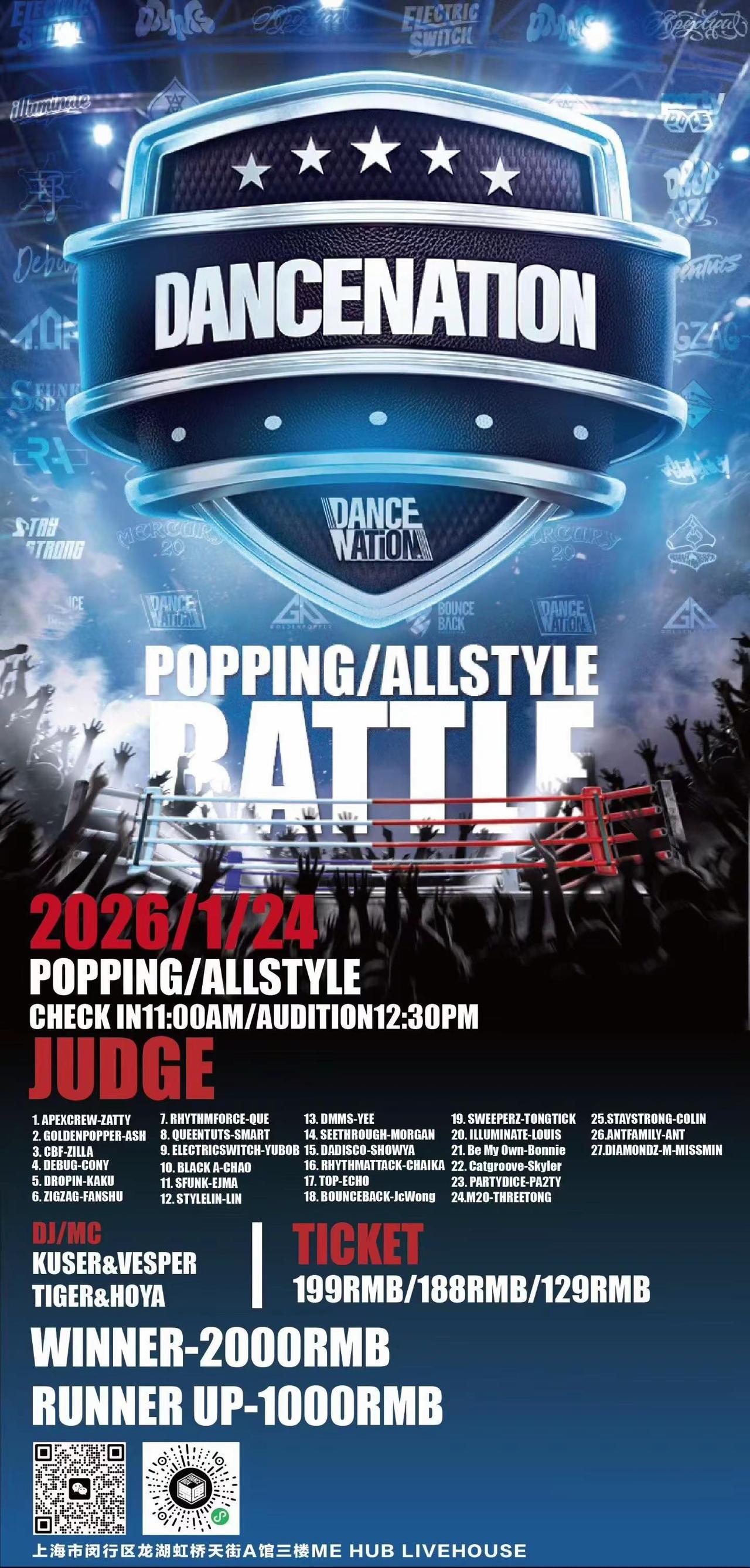 1.24号上海有个大团战。1月24日上海27支顶尖战队集结!开启百团大战。/Allstyle&Popping/双赛道全开,25位裁判坐镇,直入巅峰对决!地表最强 打call 火力全开 比赛现场