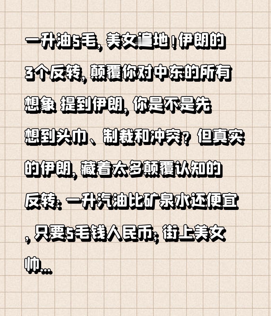 一升油5毛,美女遍地!伊朗的3个反转,颠覆你对中东的所有想象 提到伊朗,你是不是先想到头巾、制裁和冲突?但真实的伊朗,藏着太多颠覆认知的反转:一升汽油比矿泉水还便宜,只要5毛钱人民币;街上美女帅哥扎堆,波斯颜值名不虚传;5000年文明古迹随便逛,30块能住不错的酒店,这个免签的中东古国,远比你想的更神奇! 谁能想到,这个如今被制裁笼罩的国家,曾是中东最耀眼的明珠。公元前550年,居鲁士大帝建立波斯帝国,疆域横跨亚欧非,开创了人类历史上第一个超级大国,其行政制度和驿道网络至今被后世借鉴。20世纪70年代,巴列维王朝时期的伊朗更是富得流油,石油危机让它一跃成为亚洲第四经济强国,人均GDP是当时中国的12倍,首都德黑兰高楼林立、商业繁荣,被誉为“东方巴黎”,女性享有和男性平等的权利,西式教育普及,繁华程度堪比今日迪拜。 可一场1979年的伊斯兰革命,让伊朗的命运彻底转折。新政权建立后,与美国断交引发长期制裁,两伊战争打了8年,导致35万人死亡、经济损失3000亿美元,直接倒退二三十年。宗教政策收紧,女性被要求戴头巾,禁止参与部分政治和教育活动,曾经的现代化进程戛然而止。如今的伊朗,货币贬值超百倍,青年失业率高达26%,GDP不足以色列的三分之一,一边是神权体制下的保守氛围,一边是年轻人对外部世界的渴望,矛盾与挣扎随处可见。 但即便在困境中,伊朗依然藏着让人着迷的烟火气。设拉子的粉红清真寺里,阳光透过彩色玻璃洒在波斯地毯上,光影流转间宛如置身万花筒,全球女生都争相来这里打卡;伊斯法罕的三十三孔桥,枯水期的拱廊会变成露天音乐厅,市民们伴着琴声闲聊,延续着几百年的休闲传统。更戳心的是伊朗人的温情,德黑兰女婿内马特会直接把生病的岳母往医院拎,花半月工资挂号,用实际行动诠释孝顺;亲戚间互相赠送衣物,一件羊绒毛衣就是“人情欠条”,这种烟火气的互助,比任何福利政策都暖心。 在伊朗,古老与现代、保守与开放奇妙共存。你可以在大巴扎用银联卡购物,和会说中文的老板砍价;也能在四十柱宫欣赏镜面马赛克装饰,壁画上甚至有罕见的女性形象;既能在卢特沙漠感受71℃的极端高温,也能去中东最好的滑雪圣地体验速度与激情。这里的人们,虽然生活不易,却依然热情好客,会主动给游客指路,邀请你喝一杯香甜的红茶。 5000年的波斯文明,没有被制裁和冲突磨灭,反而在困境中坚守着自己的底色。它有辉煌的过往,也有现实的挣扎,更有藏在烟火日常里的温暖。伊朗告诉我们,每个国家都有不为人知的多面性,不要被刻板印象定义。 这样一个充满反转的伊朗,你愿意去看看吗?评论区聊聊你对伊朗的印象~