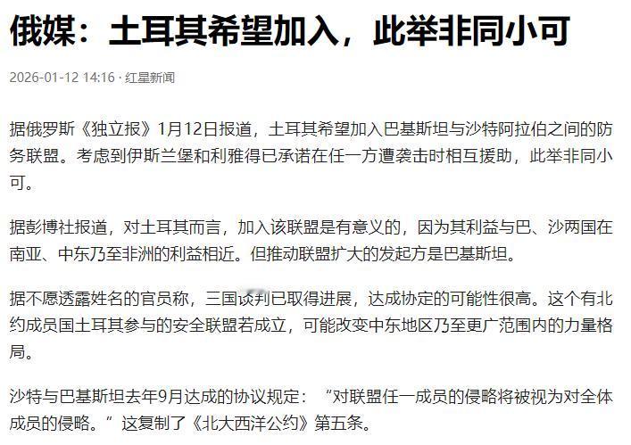 美国盟友集体跑路? 土耳其放着北约不待,非要加入有核武的巴沙联盟,美以印坐不住了? 北约要留不住土耳其了,这波操作直接让美以印集体破防!1月12日消息,土耳其正申请加入巴沙防务联盟,三国谈判已取得进展,达成协议的可能性极高。 很多人都看不懂土耳其的选择,土耳其是北约成员国,而且是北约内部第二大军事力量,放着现成的西方安全体系不依赖,非要凑巴沙联盟的热闹。这种看似反常规的操作,背后全是土耳其实打实的利益考量。 土耳其对北约的不满早就藏不住了,多年来土耳其一直想加入欧盟,却始终被欧洲国家拒之门外,核心原因就是宗教文化差异带来的排斥感。欧盟的大门对土耳其紧闭,美国的态度也没好到哪里去。土耳其想买美式先进武器,总要看美国脸色,甚至连F-35隐形战机研发项目都被美国踢了出去。美国还曾因为土耳其从俄罗斯采购S-400防空系统,直接对土耳其实施制裁。 美国的战略摇摆更让土耳其寒心,尤其是美国总统特朗普反复无常的言行,让包括土耳其在内的诸多盟友都开始怀疑美国履行北约义务的可靠性。在巴以冲突等地区事务上,美国一味偏袒以色列,完全忽视土耳其的立场和利益。土耳其总统埃尔多安多次批评以色列在加沙的行为,甚至断绝与以色列的部分关系,实施贸易制裁,这种态度和美国的纵容形成鲜明对立。 巴沙联盟能给土耳其的,恰恰是北约给不了的东西。巴沙联盟是巴基斯坦和沙特在2025年9月签署防务协议组建的,核心条款和北约集体防御原则类似,明确对任一成员的侵略就等同于对全体成员的侵略。更关键的是,巴基斯坦是伊斯兰世界唯一拥有核武器的国家,加入联盟就意味着土耳其能获得巴基斯坦的核保护伞,这对缺乏核力量的土耳其来说,是极具吸引力的安全保障。 三方合作还能形成完美的利益互补,沙特手握雄厚财力,能为三方的军事合作和技术研发提供充足资金;巴基斯坦有成熟的核武器和弹道导弹技术,能强化联盟的战略威慑力;土耳其则有实战经验丰富的武装力量和发达的军事工业,尤其是无人机领域实力突出,三方各取所需,利益契合度极高。 土耳其和沙特的关系修复也为合作扫清了障碍,此前两国曾因多种问题产生分歧,关系一度跌入低谷。但近年来双方有意缓和矛盾,不仅恢复高层互访,还深化经济和能源合作,双边贸易额大幅增长。不久前两国还举行首次海军会议,就联合军演等议题磋商,为防务领域深度合作铺路。 这波操作最慌的就是美国,土耳其是北约南翼的关键国家,控制着黑海海峡,地缘位置至关重要。一旦土耳其倒向巴沙联盟,就相当于在中东埋下了不依附美国的力量支点,直接稀释美国在中东的影响力。更让美国焦虑的是,这可能引发连锁反应,其他北约盟友或许会跟着寻求“第二安全保障”,美国主导的盟友体系将面临分裂风险。 以色列的紧张感一点不比美国少,以色列一直默认自己是中东唯一拥核国家,巴沙土联盟一旦成型,巴基斯坦的核威慑力加上沙特的财力、土耳其的军事技术,会直接打破以色列的地区核威慑优势。土耳其本身就和以色列关系紧张,加入联盟后,以色列在加沙、黎巴嫩等问题上的操作空间会被大幅压缩,周边安全环境将急剧恶化。 印度的“破防”则源于对巴基斯坦的战略焦虑,2025年5月印巴刚爆发过冲突,如今巴基斯坦要是有了土耳其和沙特做后盾,军事实力会进一步提升。土耳其和巴基斯坦早已开展军工合作,比如土耳其帮巴基斯坦升级F-16战斗机,推动共同参与第五代战斗机项目,这些合作都会直接削弱印度在克什米尔问题上的优势。沙特还是印度重要的能源伙伴和投资来源国,三方深度绑定后,印度在中东的经济和地缘利益也会受冲击。 需要明确的是,土耳其寻求加入巴沙联盟,并不意味着会彻底脱离北约。土耳其三分之四的直接投资来自欧美,军队与北约仍有紧密联系,短期内不可能完全割裂。这种操作本质是土耳其的“战略对冲”,通过构建平行关系扩大自身谈判空间,在复杂的地缘格局中最大限度维护自身利益。 这一事件的核心逻辑很清晰,国际舞台上没有永远的盟友,只有永远的利益。美国的霸权任性和北约承诺的空洞,让地区国家开始重新审视安全保障方式。巴沙联盟的吸引力,本质是地区国家追求战略自主的体现。 如果三方最终达成协议,将形成横跨南亚、中东的强大力量组合,被外界称为“伊斯兰版北约”的雏形,可能重塑地区安全架构。埃及、卡塔尔等地区国家或许会跟进考虑加入,进一步壮大非西方阵营的力量。 美以印的集体紧张,说到底是因为它们习惯了主导地区格局,突然面对这种利益重组的变化难以适应。土耳其的这步棋,不仅改变了自身的战略处境,更让全球多极化趋势在中东地区的体现更加明显。后续谈判能否落地还需观察,但地区国家寻求自主安全保障的趋势已经不可逆转。