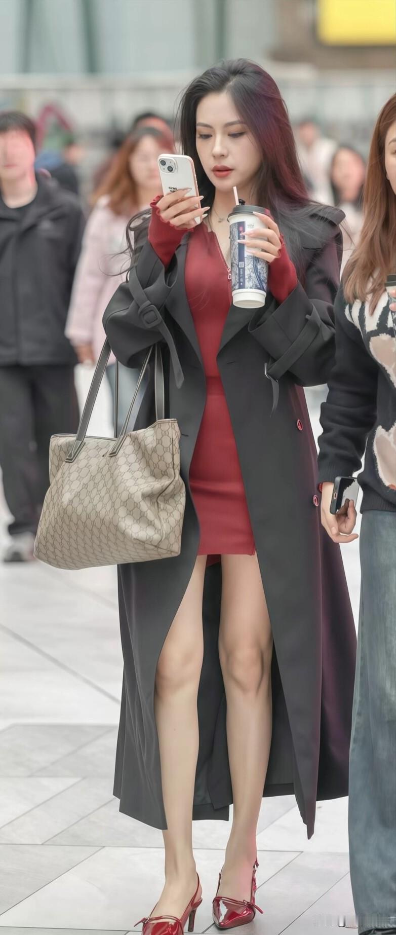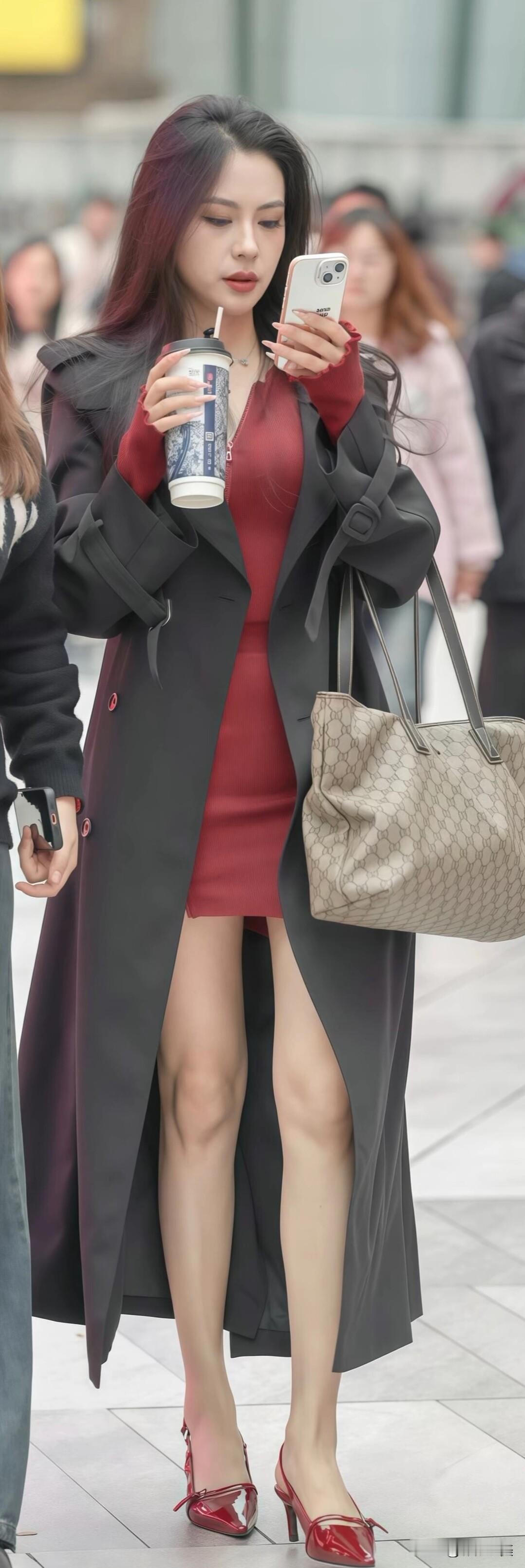 红黑配色又美又飒,修身红裙+长款黑风衣,走路带风,回头率直接拉满✨