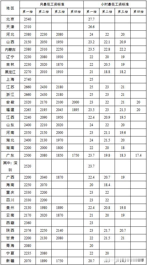 最低工资标准,是指劳动者在法定工作时间或依法签订的劳动合同约定的工作时间内提供了正常劳动的前提下,用人单位依法应支付的最低劳动报酬。所称正常劳动,是指劳动者按依法签订的劳动合同约定,在法定工作时间或劳动合同约定的工作时间内从事的劳动。劳动者依法享受带薪年休假、探亲假、婚丧假、生育(产)假、节育手术假等国家规定的假期间,以及法定工作时间内依法参加社会活动期间,视为提供了正常劳动。 目前,最低工资标准档位最多为四档。数据显示,从月最低工资标准看,上海以2740元的标准居全国首位;从小时最低工资标准看,北京以27.7元的标准为全国最高。 其中,广西第一档月最低工资标准为2200元,第一档小时最低工资标准为22.4元。 广西并不是最低工资标准最少的省份(自治区),低于广西的有贵州、青海、云南、西藏。 不同地区最低工资标准的差异,其实反映出各地经济发展水平、生活成本等多方面的不同。像上海这样月最低工资标准居全国首位,是因为其作为国际化大都市,生活成本较高,且产业结构以高端服务业、金融等为主,对劳动力素质要求高、劳动价值创造能力强。而广西虽然不是最低,但与上海相比仍有差距,这也体现出广西在产业发展、经济活力等方面还有很大的提升空间。 对于那些最低工资标准较低的省份(自治区),如贵州、青海、云南、西藏,它们大多处于我国中西部地区,地理环境、交通条件等因素在一定程度上限制了经济的快速发展。不过,随着国家一系列扶持政策的实施,这些地区也在不断努力追赶。比如加大基础设施建设投入,改善交通、通信等条件,吸引投资;发展特色产业,像贵州的大数据产业、云南的旅游业等,为经济增长注入新动力,未来其最低工资标准也有望逐步提高。 最低工资标准不仅关系着劳动者的切身利益,也影响着企业的用工成本和发展。合理的最低工资标准能保障劳动者的基本生活,促进社会公平正义;同时也促使企业提高生产效率、转型升级,以应对成本压力。相信在经济持续发展的过程中,各地的最低工资标准会更加科学合理,更好地平衡劳动者、企业和社会三方的利益。