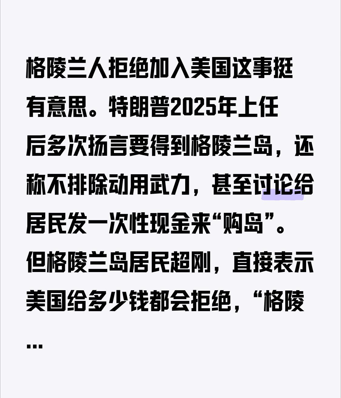 格陵兰人拒绝加入美国这事挺有意思。特朗普2025年上任后多次扬言要得到格陵兰岛,还称不排除动用武力,甚至讨论给居民发一次性现金来“购岛”。但格陵兰岛居民超刚,直接表示美国给多少钱都会拒绝,“格陵兰岛属于我们,只属于我们”。 为啥这么坚决?主要是福利。丹麦长期给格陵兰不错的福利,人家过得好好的,干嘛要去美国。而且当地政党也声明,格陵兰未来由自己人决定,让美国别“蔑视”,得按外交原则来。看来,给钱也撬不动格陵兰人的心啊。