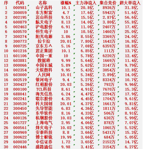 1月14日上午盘,主力趁低位,大幅买入的30名单: 山子高科:涨幅 10.10%(涨停),净流入 20.8亿元 东方财富:涨幅 4.70%,净流入 17.6亿元 岩山科技:涨幅 9.51%,净流入 15.5亿元 航天电子:涨幅 8.13%,净流入 14.0亿元 沪电股份:涨幅 6.91%,净流入 11.0亿元 1月14日中午收盘,主力资金“大幅卖出”的30名单: 海格通信:涨幅 10.00%(涨停),净流入 -12.0亿元 特变电工:涨幅 7.01%,净流入 -10.5亿元 金风科技:涨幅 2.77%,净流入 -9.90亿元 中国卫星:跌幅 0.04%,净流入 -8.56亿元 东方通信:涨幅 8.20%,净流入 -7.13亿元