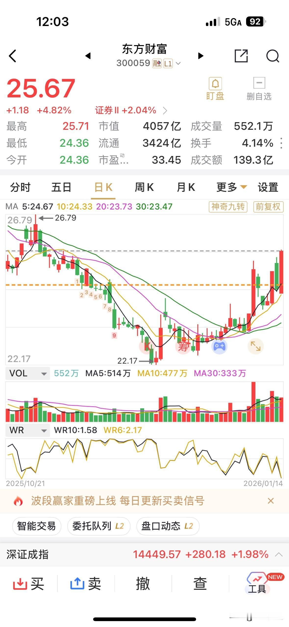 券商终于不想再被压制了,板块上涨2%,我们的人气股东方财富大涨近5%,市值再度重回4000亿元之上。 与中信证券的4300亿元市值又只剩下250亿元的空间,6%左右的空间中信证券这是要停下来等待东财的反超啊! 东财早盘的走势相当优异,在大中型券商中独领风骚,量价配合下,有望持续领先于板块的表现。 对于个股不必惧高,目前东财虽26年来涨幅超过10%,但连25年的跌幅都尚末收复。 个人持股观点,勿作操作建议。