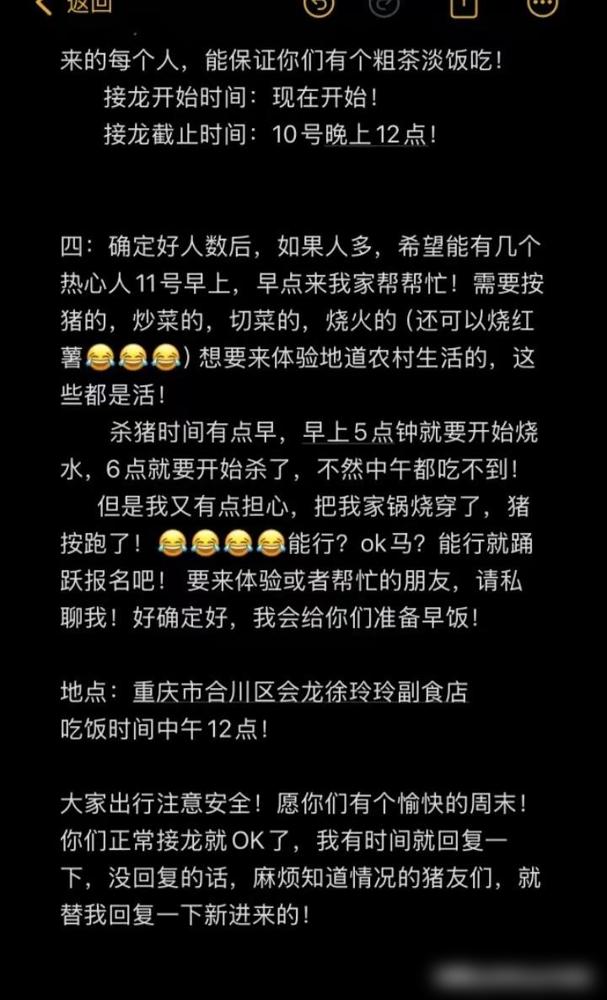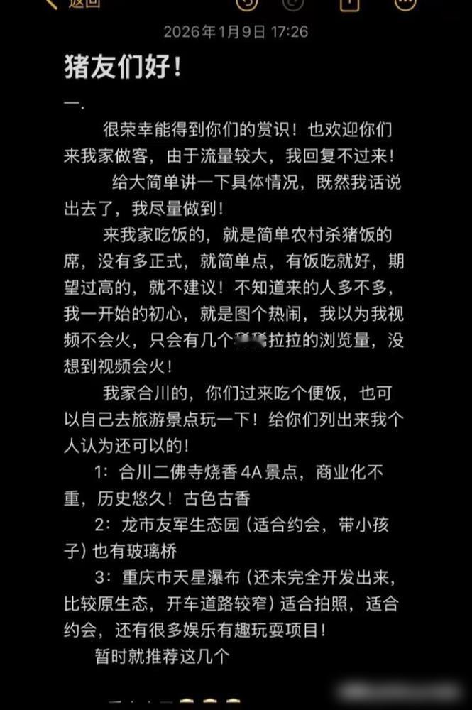 一个人的气运到了,谁也挡不住,重庆合川的呆呆,这两天估计能赚200万。这姑娘23岁,在县城开美甲店,日子过得踏实。谁能想到,就因为家里要杀两头年猪,怕爸妈按不住猪脚,她随手发了条抖音喊网友来帮忙,结果直接火出圈——家门口几公里停满车,上千人来吃杀猪饭,直播间礼物刷不停,粉丝从几百涨到上百万。 咱中年人看这事儿,就俩字儿:真诚。呆呆没想着炒作,发视频时还特意说“农村饭席,别抱太高期望”,甚至提前打预防针可能没凳子、用一次性碗筷。就这股子实在劲儿,反而戳中了好多人的回忆——谁小时候没跟着大人去吃过杀猪饭?热热闹闹围一起,大锅里炖着肉,灶火映红人脸,那是最实在的烟火气。 更暖心的是,村委会和文旅局反应快,听说人多不够吃,立马送猪来;还有网友主动补猪。这哪是单纯蹭饭?分明是大家借着由头,想给这姑娘撑个场。现在湖南又有个灿灿跟着学,准备了10头猪,接龙8500人。你看,年轻人用最土的“杀年猪”,玩出了最潮的流量——不套路、不摆谱,把老家的烟火气变成了金招牌,这才是咱愿意看的“乡村故事”啊!