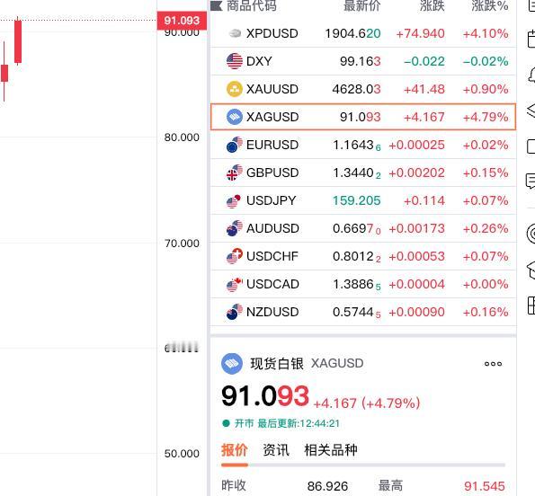 快讯,快讯! 现货白银价格突破91关口, 再创历史新高! 现货白银报价91.093美元, 较上一日上涨4.167美金, 涨幅为4.79%。 真是没有最高,只有更高! 看来白银距离100美元关口, 越来越近了。您持有?