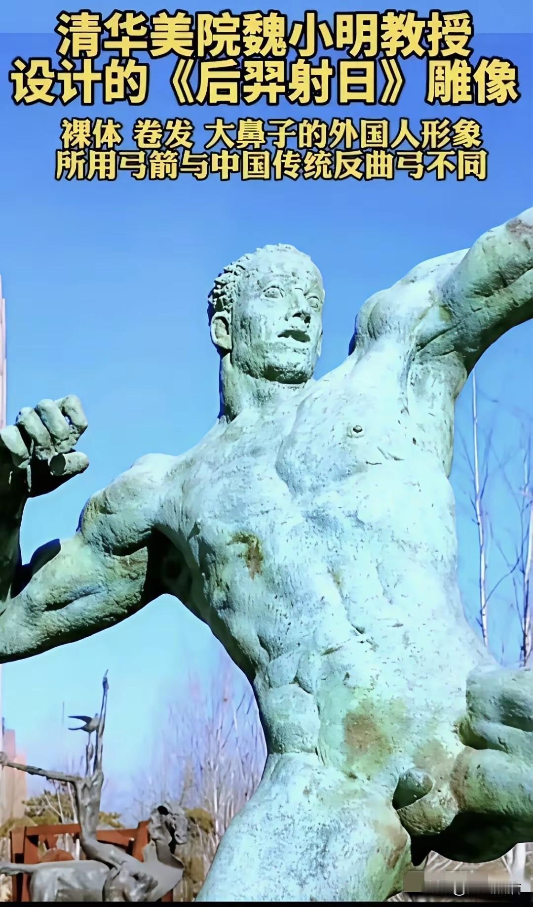 这人是真敢啊, 后羿雕塑竟然被设计成了卷发和西方的模样,而且还和西方雕塑一样是全裸出镜,这可与大众的审美完全不匹配,竟然能把古代的神话人物刻的不中不洋,不伦不类,清华美院的博导可算是出类拔萃了。 不要以为喝了几滴洋墨水,就一味的标榜个性,似乎设计成正常的模样就显得没有水平,看来这些人的思想确实变了。