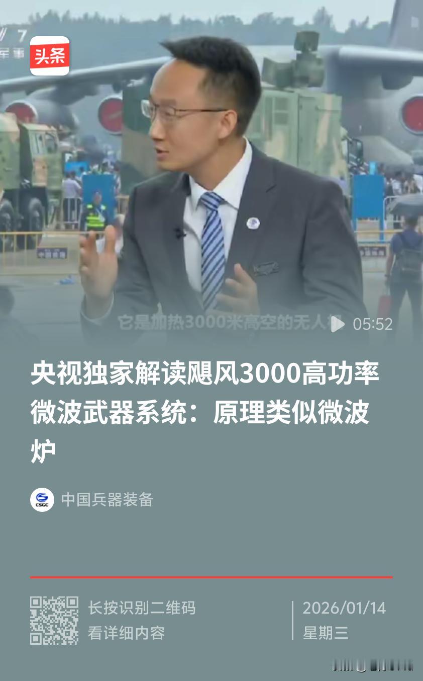 据《俄罗斯报》等外媒报道,中国“飓风 - 3000”反无人机系统专治蜂群无人机。它由中国兵器工业集团研制,2025年9月3日抗战胜利80周年阅兵式首次公开。 核心功能 该系统主要用于拦截3000米内轻小型无人机及无人机蜂群,突破传统定点防护局限,实现区域防空压制。 工作原理 系统核心是发射高功率微波束,类似威力巨大的微波炉,释放的微波能量能瞬间“加热”并烧毁无人机内部精密电路和芯片,和仅干扰信号的“软杀伤”有本质区别。 作战流程 ● 探测:自带雷达特别灵敏,6公里外就能发现无人机踪影,车载雷达也能在复杂环境发现目标,捕捉低空慢速的“低慢小”无人机。 ● 跟踪:等无人机飞到4公里范围,系统自动切换到精准跟踪模式;光电设备也可接力,对目标进行毫米级精度持续跟踪与锁定,还能提前20秒预警。 ● 打击:微波发射装置定向释放高功率电磁脉冲,以光速覆盖目标区域,10秒内就能完成发现、锁定、摧毁。 核心优势 ● 高效应对蜂群:微波束可覆盖扇形区域,形成“电磁拦截网”,一次照射能瘫痪多架无人机,适合应对低成本无人机蜂群“饱和攻击”。 ● 低成本:系统“弹药”是电能,单次发射成本仅需几美元,相比防空导弹成本效益优势巨大。 ● 持续作战:只要平台电力供应充足就能持续发射。 ● 部署灵活:采用高机动卡车底盘,可快速部署至边防、海防、重要城市设施等区域。 局限性 效能可能受地形遮挡影响,若无人机增加电磁屏蔽防护,毁伤效果或被削弱。通常它会与“红旗 - 11”弹炮合一系统、“沉默狩猎者”激光武器等组成反无人机“铁三角”,构建多层防御体系。