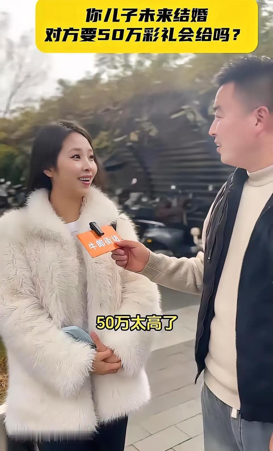 上海一个街头采访,可把我笑坏了! 真的笑不活了!上海街头这采访,简直戳中了多少人的笑点和痛点!记者逮住一位美女就问:“你儿子长大结婚,女方要50万彩礼,你给不给?”美女想都没想,脱口而出:“我不给!”记者追问那还结不结婚,美女更绝:“换一个!” 这话一出,记者当场笑喷,美女自己也笑得直不起腰。记者不死心又问是不是找不要彩礼的,美女摆摆手:“彩礼可以有,12万8就挺合适,50万纯属狮子大开口!” 你瞅瞅这事儿,多现实!很多人当丈母娘时恨不得彩礼要上天,轮到自己当婆婆,立马就嫌彩礼高了。说到底,彩礼本是个心意,硬生生被搞成了买卖,真心不如量力而行来得实在。 你觉得多少彩礼才算合理?评论区聊聊呗!