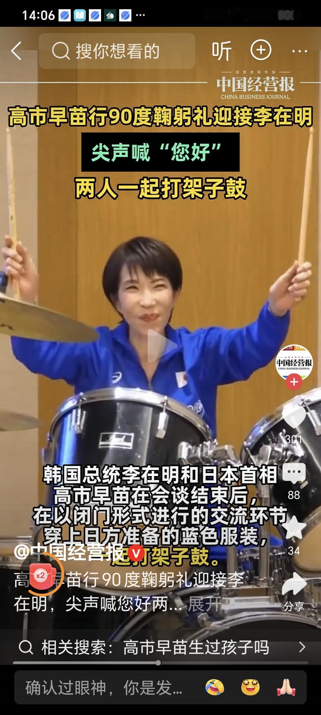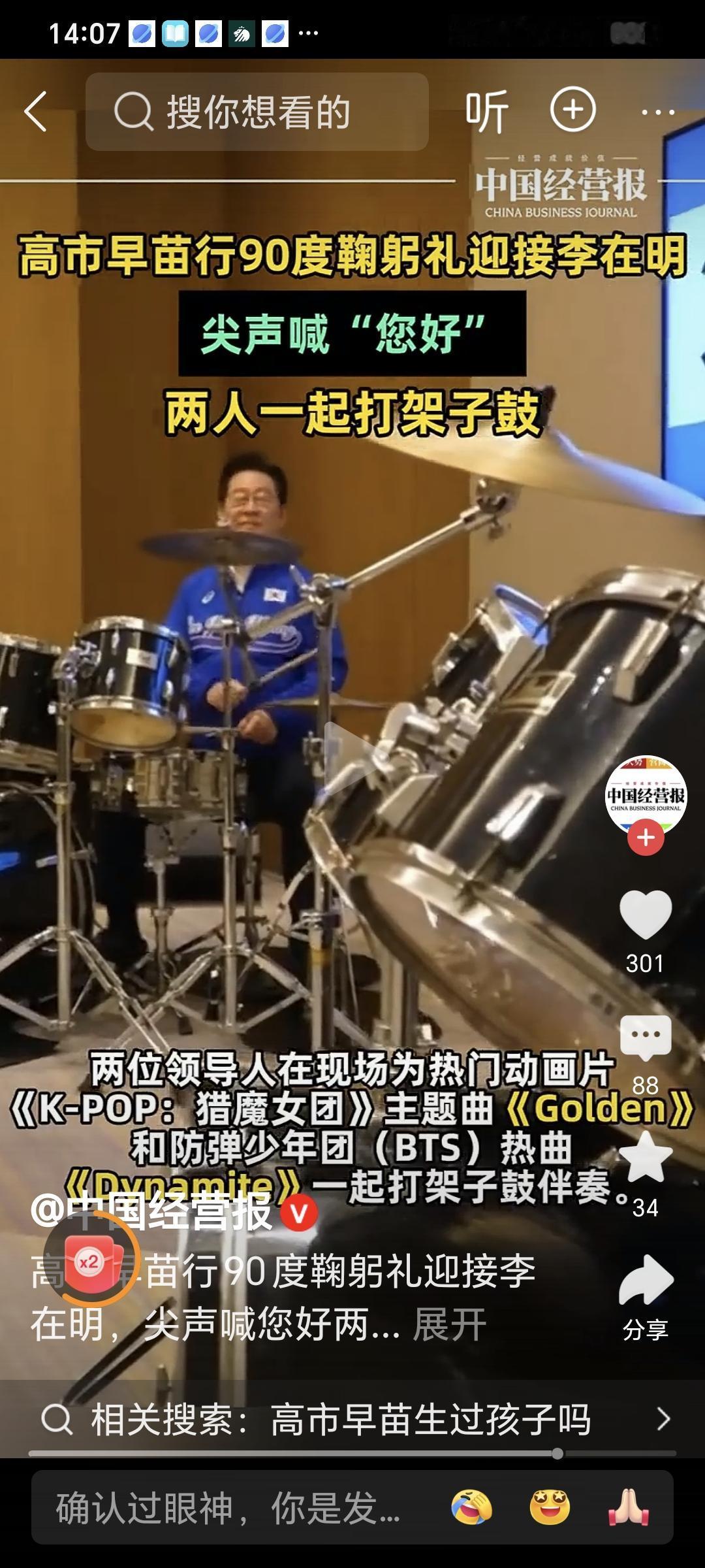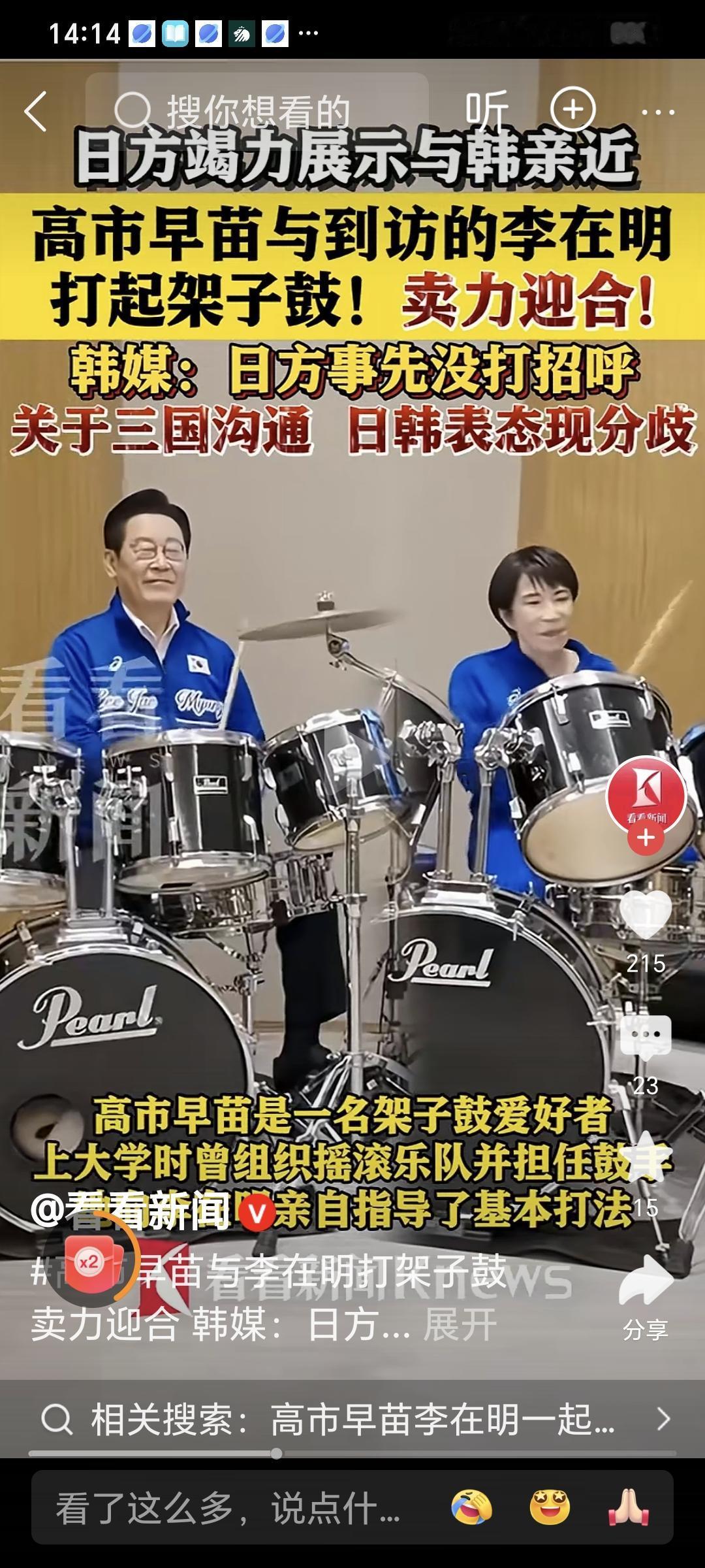 李在明与高市早苗一起打架子鼓 李在明称赞高市早苗是专业的高手,并说自己很笨拙。年轻的时候,高市早苗曾经是乐队的鼓手。 李在明在奈良,和高市早苗一起打鼓,瞬间把全世界韩粉日粉都炸了!严肃正襟危坐谈完供应链、经济安保,转身换上配套蓝色套装,两人各坐一套鼓组,高市直接上手教学,李在明从生疏到跟上节奏,敲BTSicon《Dynamiteicon》时全场high翻,又接Netflixicon《Kpop猎魔女团》金球奖icon主题曲《Golden》,鼓点一响,隔阂好像全碎了! 两国元首身着蓝色服装亮相,现场气氛轻松。 李在明,“虽然节奏可能略有不同,但配合节奏的愿望是一样的,我们将共同努力打造面向未来的韩日关系。” 两人还穿着一样的衣服,只是胸前的国旗不同。韩联社的报道说,这是日方未提前通知而准备的一场特别活动。 这是韩国为日本击鼓,还是日本为韩国击鼓? 活动现场摆放了两套架子鼓,高市早苗向李在明赠送鼓棒并教其打法。两位领导人在现场为热门动画片《K-POP:猎魔女团》主题曲《Golden》和防弹少年团(BTS)热曲《Dynamite》一起打架子鼓伴奏。合奏结束后,双方在鼓棒上签名并互赠。 李在明和高市早苗,一块打鼓。 看起来,他们玩的很放松,很开心,从面部表情可以看出来,那笑的过于灿烂。 这种会晤,与其说是会晤,不如说是玩一玩,不谈政治,反而轻松愉悦,谈起来政治,表情就不那么美妙了。 李在明很聪明,务实外交,不简单的选边站,在各个大国之间的缝隙中生存。高市很有心,因为她上次访韩时李曾说过,高市会开赛车和打架子鼓都曾是李梦想做的事。结果这次安排上了。老李刚刚吃完中餐,又去小本子玩架子鼓,后天可能又去美国吃汉堡,小心啊!只为自己利益,没什么毛病,不破坏签署协议就行。