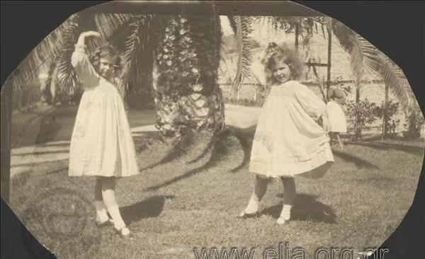 我们又是双胞胎了 妹妹(伊丽莎白)与自己出生日期的短暂间隔永远让奥尔加感到有趣,后来她习惯在伊丽莎白生日那天在日记中写道:“这18天里我们又是双胞胎了。” 1911,希腊和丹麦的奥尔加公主和伊丽莎白公主在花园中表演舞蹈